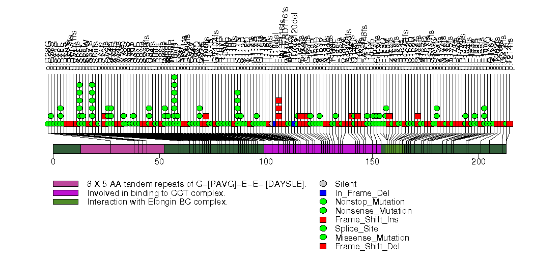 Figure S4. This figure depicts the distribution of mutations and mutation types across the VHL significant gene.