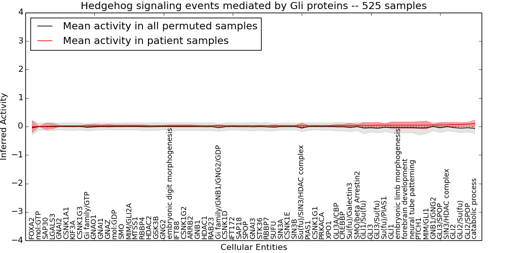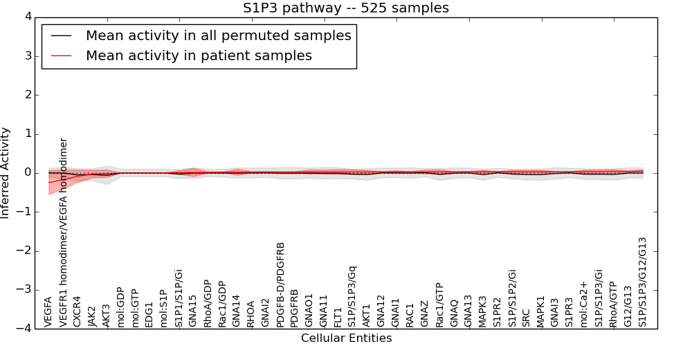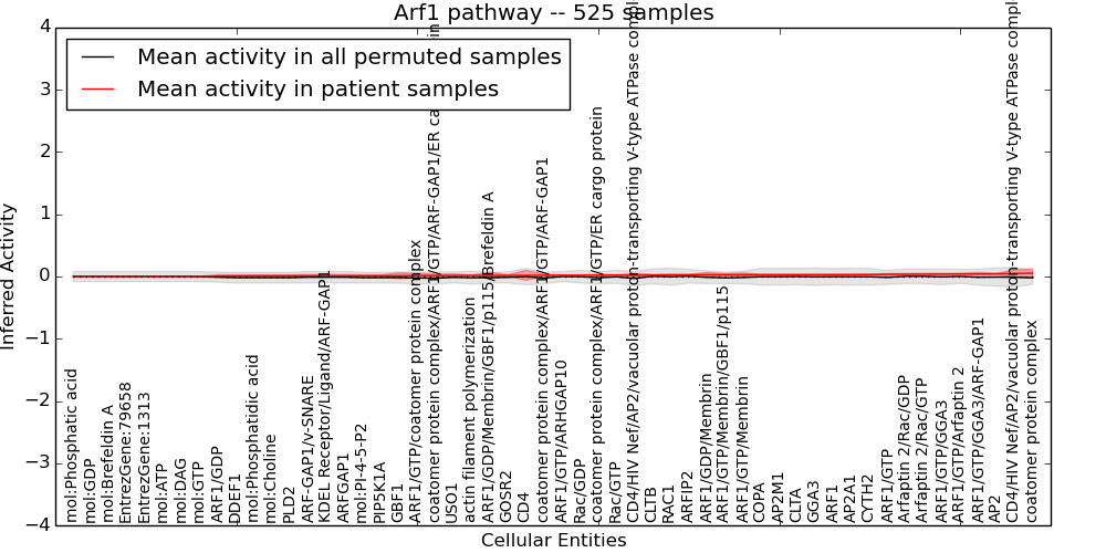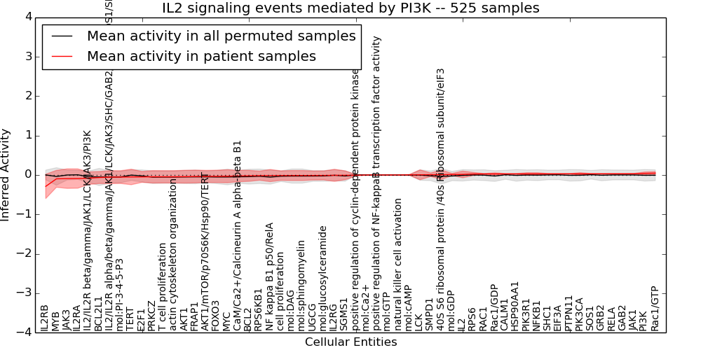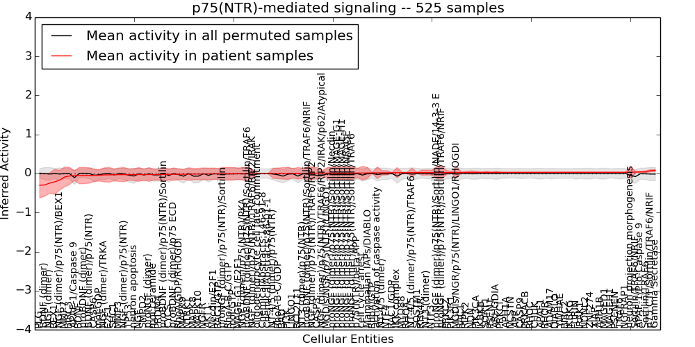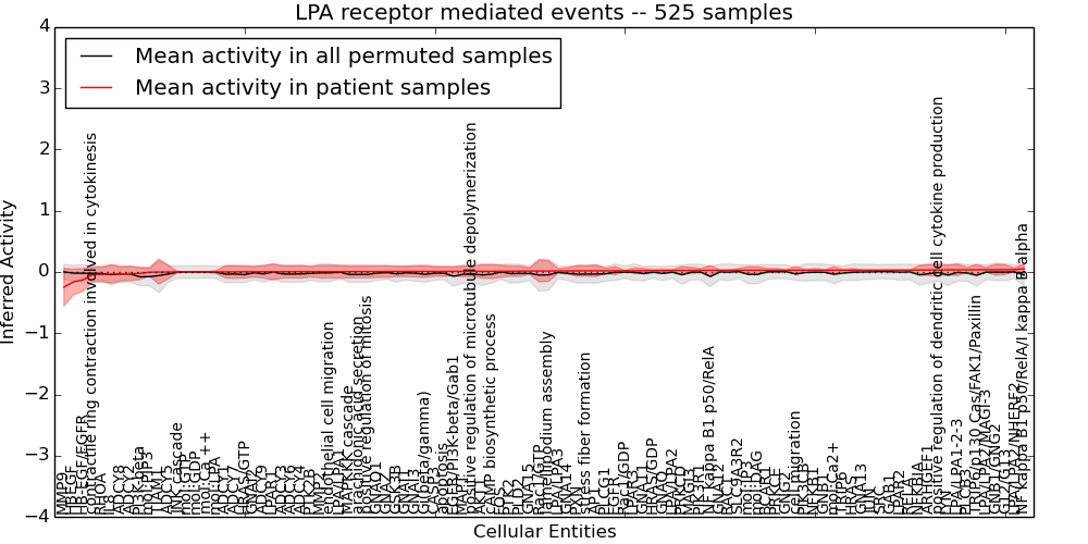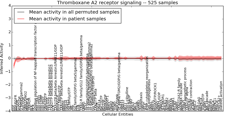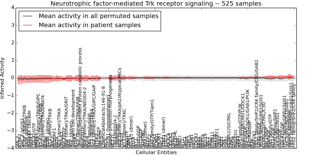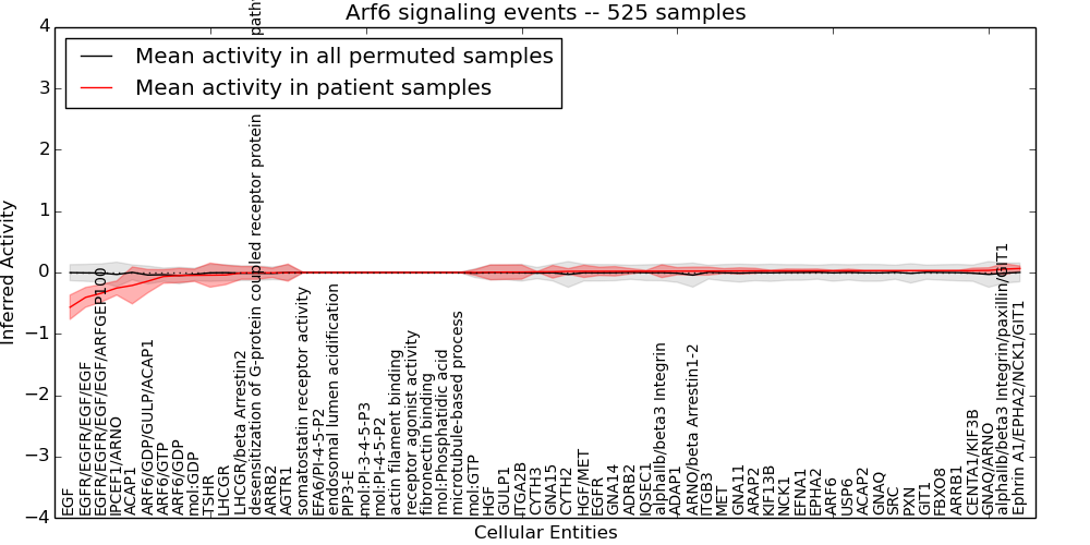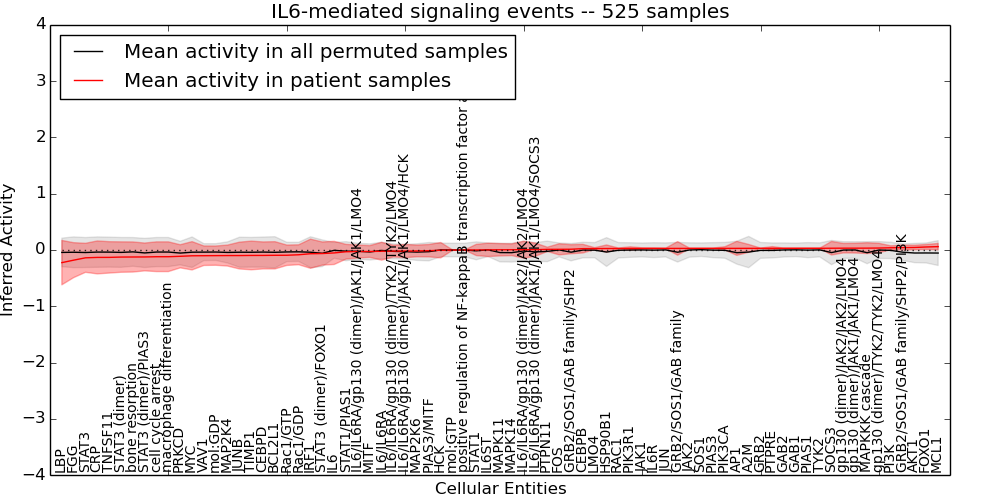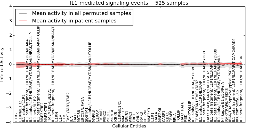Figure S131. Get High-res Image This plot shows pathway concept perturbations across all samples against a permutation model. The concepts along the x-axis are sorted by lowest to highest mean activity for the real patient samples. Mean inferred activities are plotted along the y-axis as a colored band showing the average level and one standard deviation range. Real samples are shown in red and permuted samples in black.