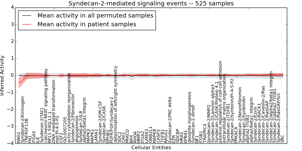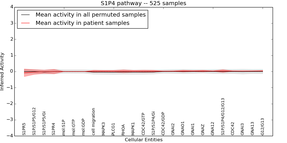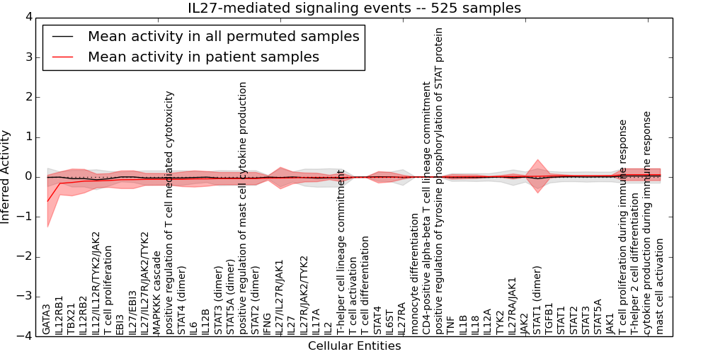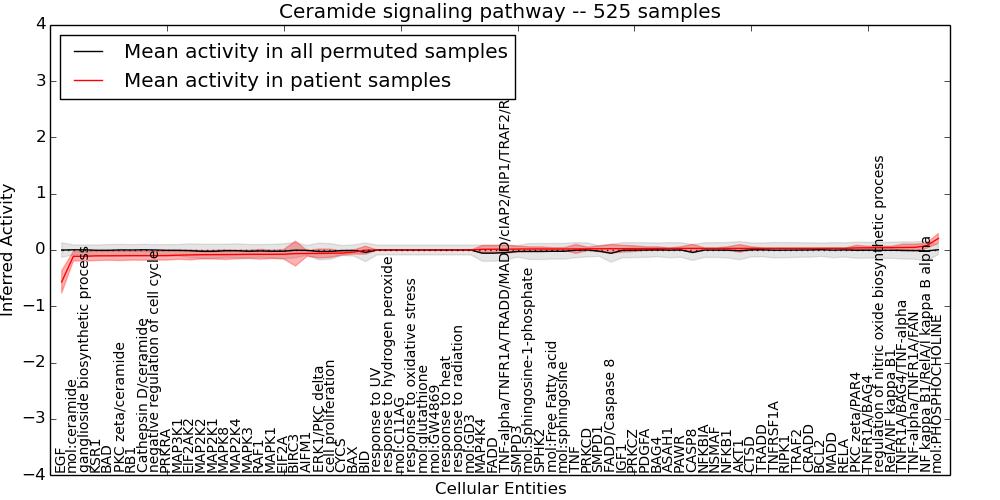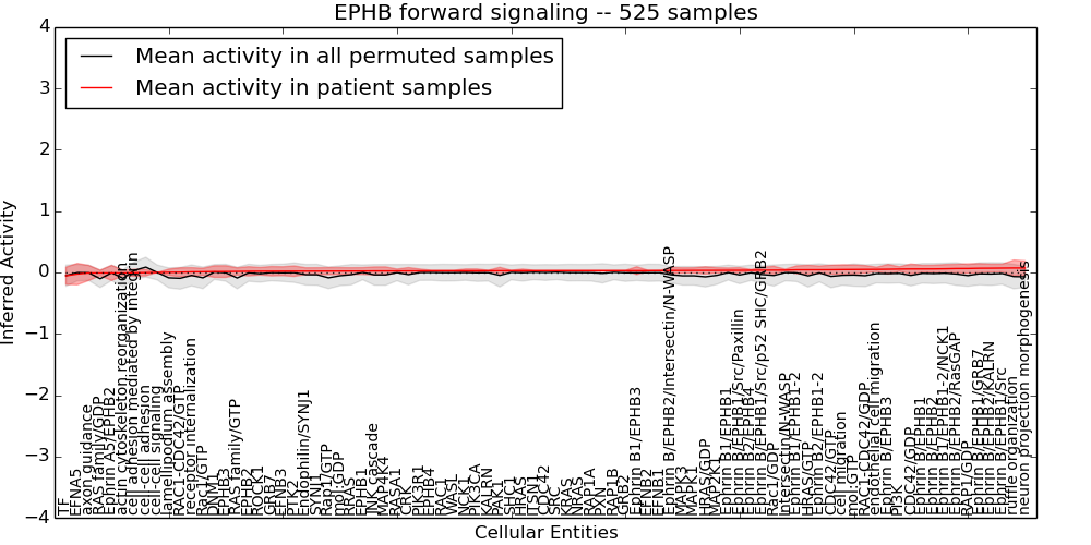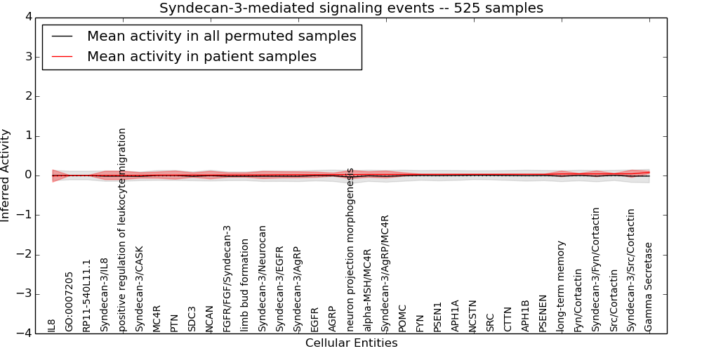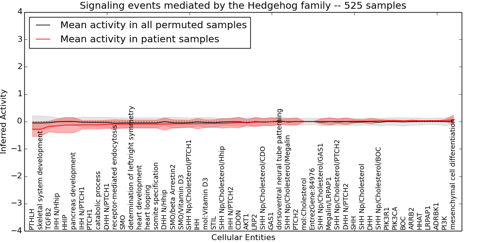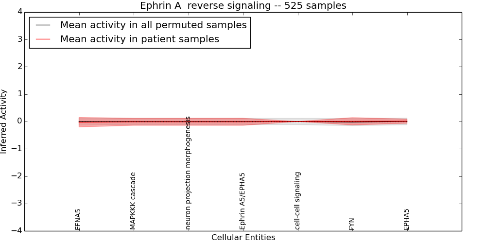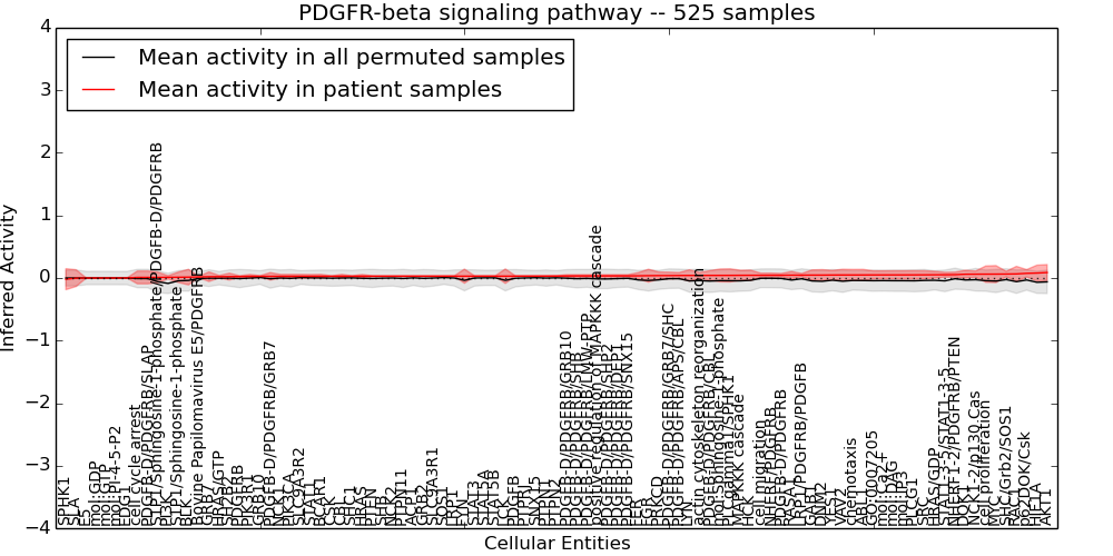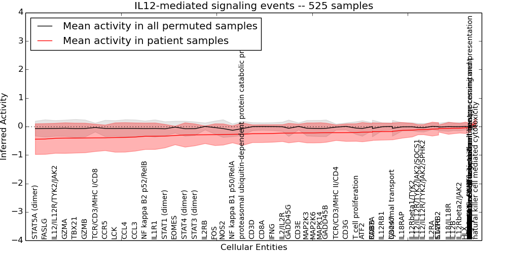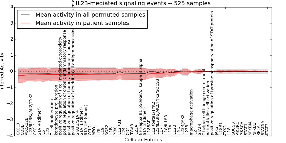 Figure S131. Get High-res Image This plot shows pathway concept perturbations across all samples against a permutation model. The concepts along the x-axis are sorted by lowest to highest mean activity for the real patient samples. Mean inferred activities are plotted along the y-axis as a colored band showing the average level and one standard deviation range. Real samples are shown in red and permuted samples in black.