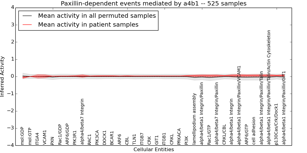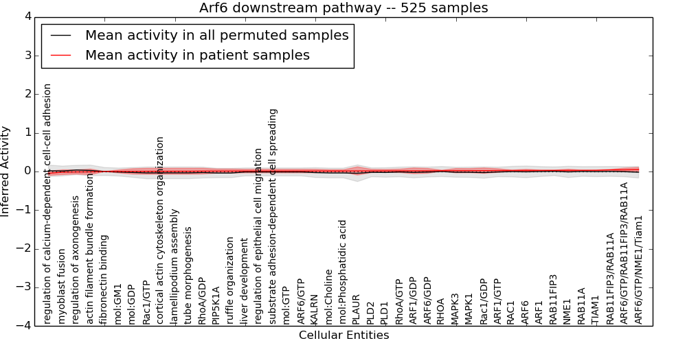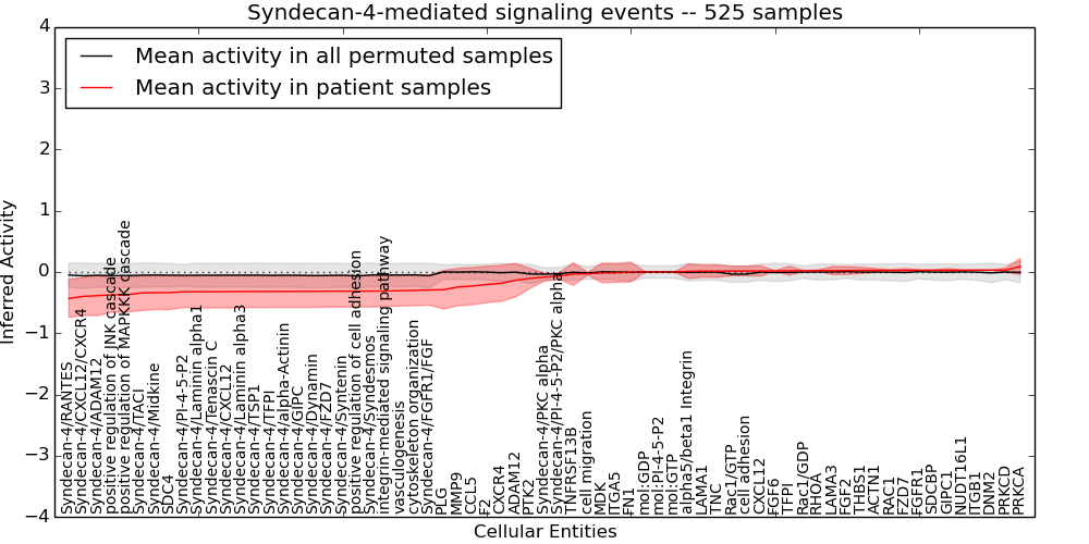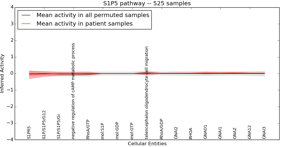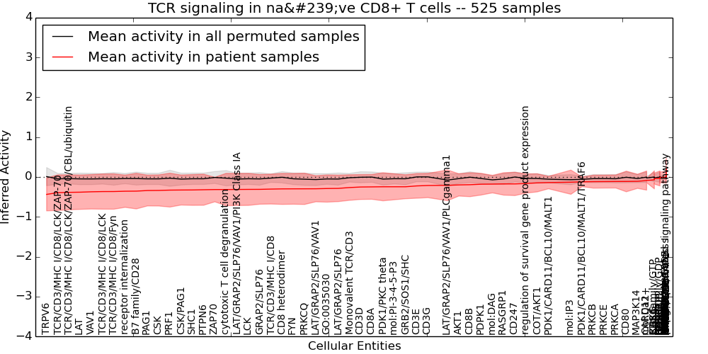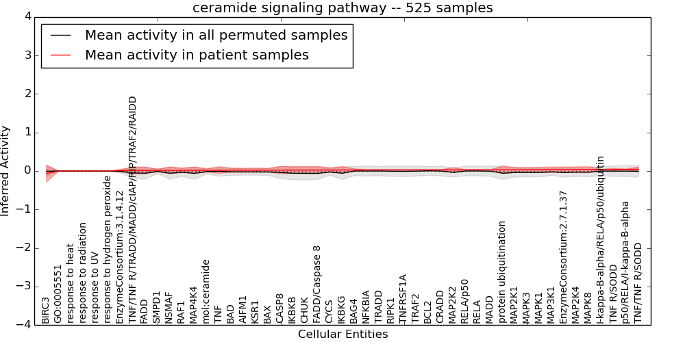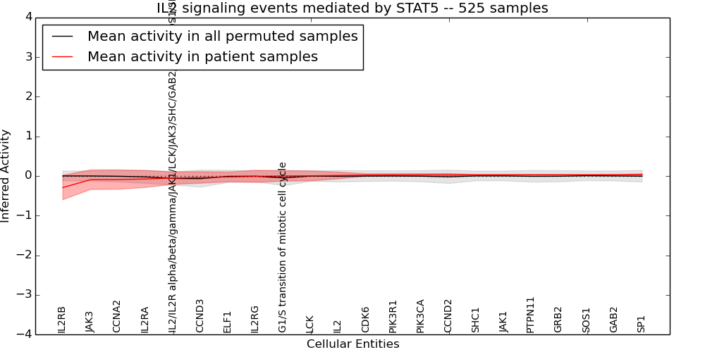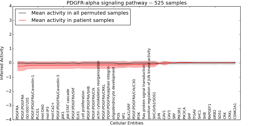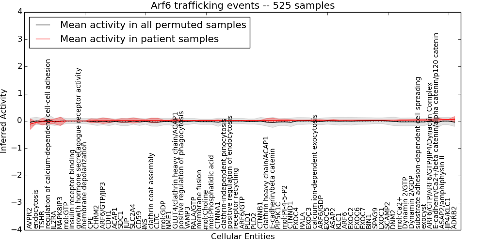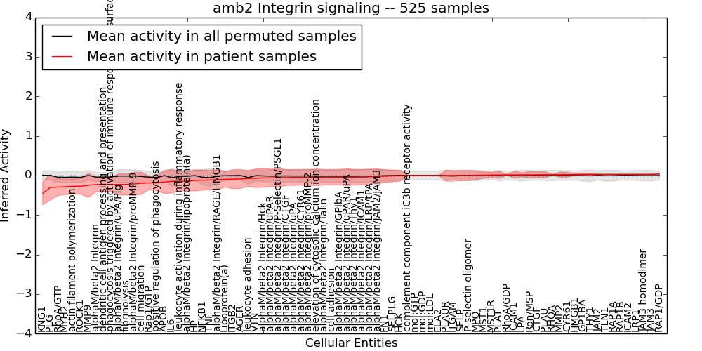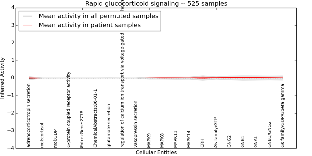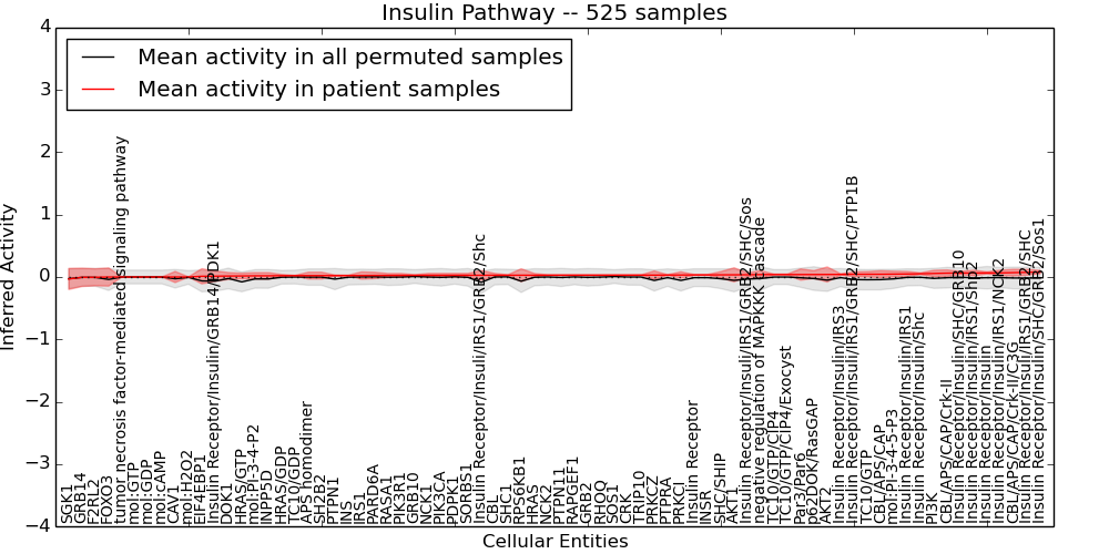 Figure S131. Get High-res Image This plot shows pathway concept perturbations across all samples against a permutation model. The concepts along the x-axis are sorted by lowest to highest mean activity for the real patient samples. Mean inferred activities are plotted along the y-axis as a colored band showing the average level and one standard deviation range. Real samples are shown in red and permuted samples in black.
