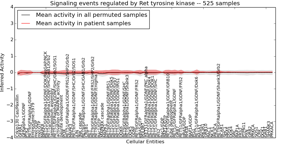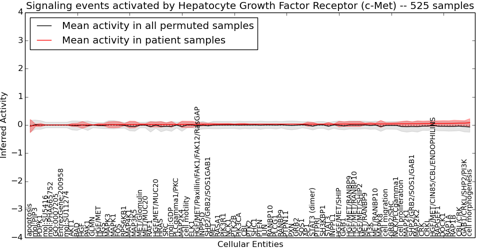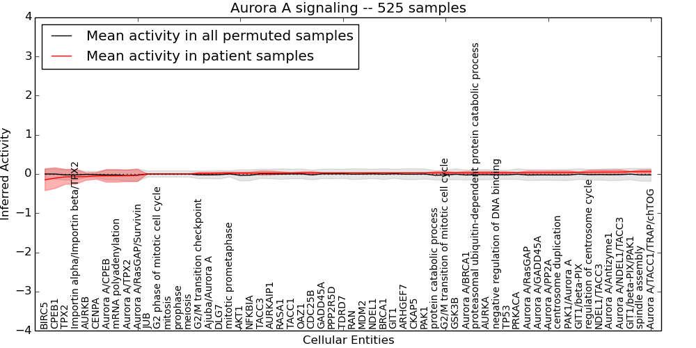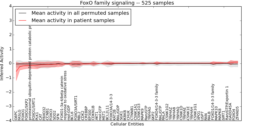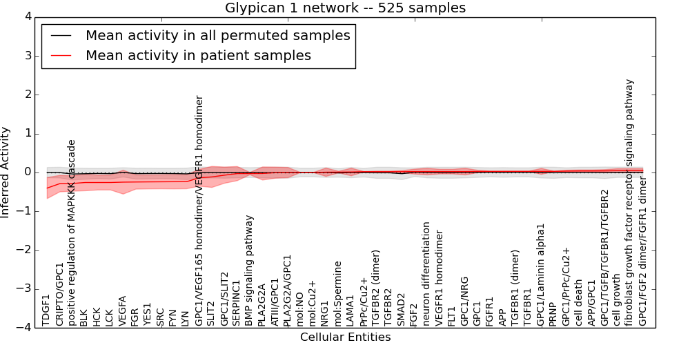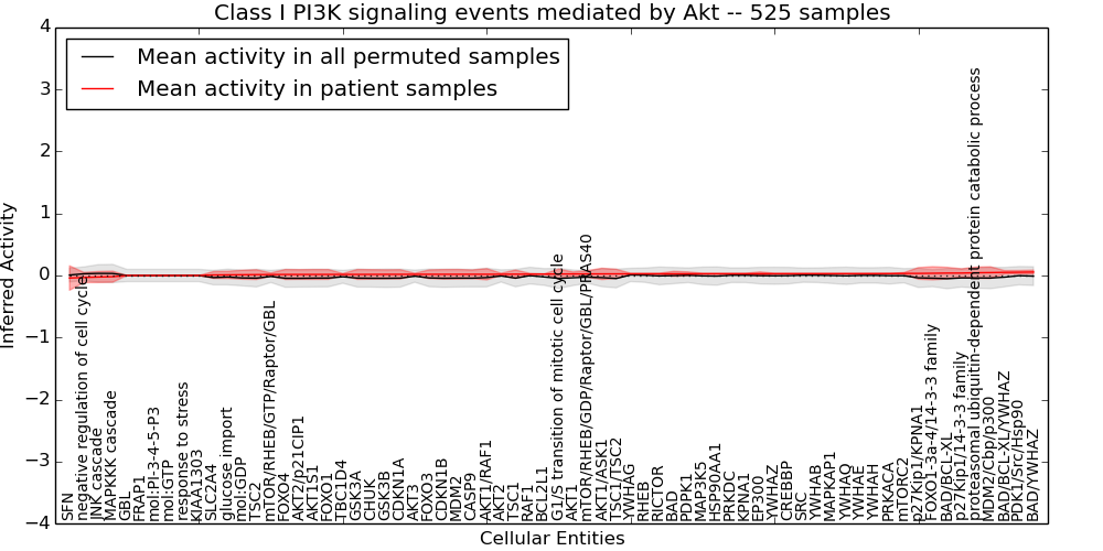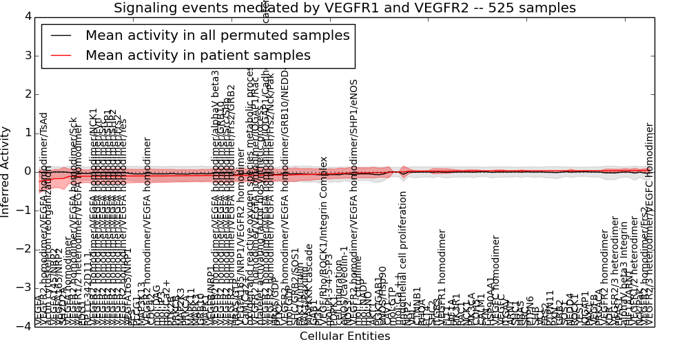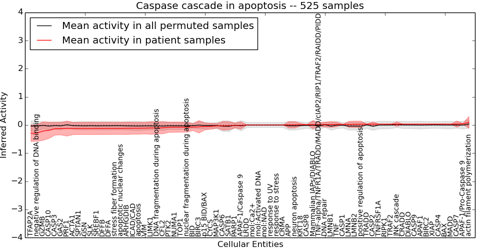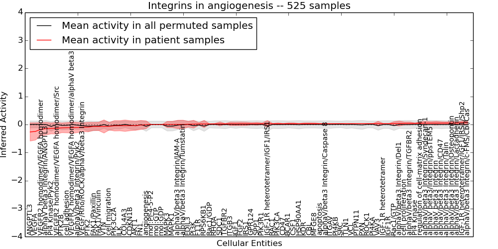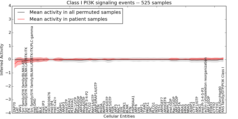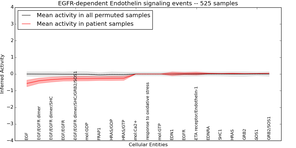 Figure S131. Get High-res Image This plot shows pathway concept perturbations across all samples against a permutation model. The concepts along the x-axis are sorted by lowest to highest mean activity for the real patient samples. Mean inferred activities are plotted along the y-axis as a colored band showing the average level and one standard deviation range. Real samples are shown in red and permuted samples in black.