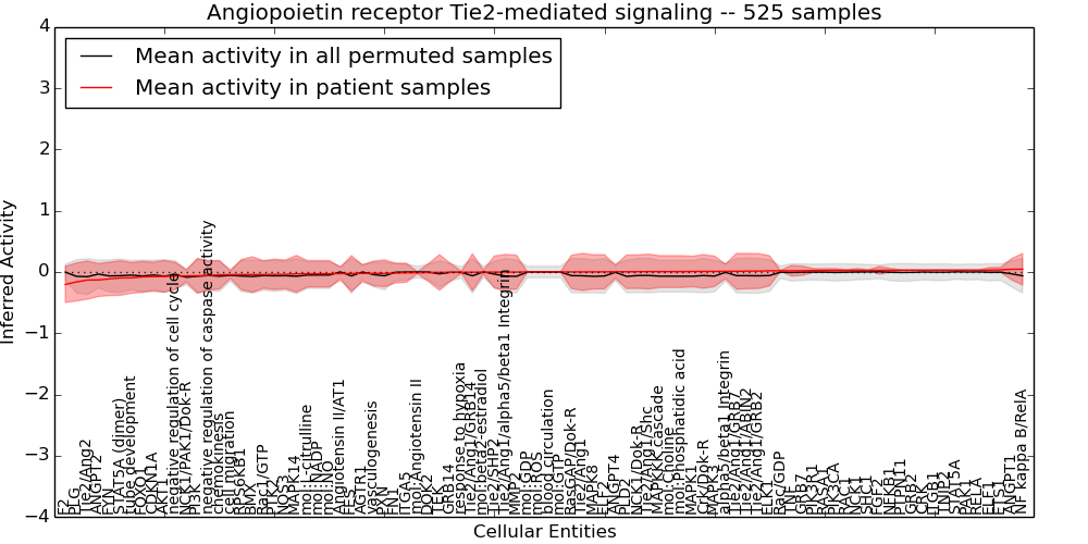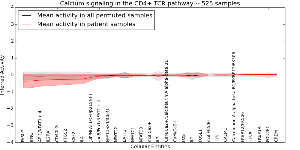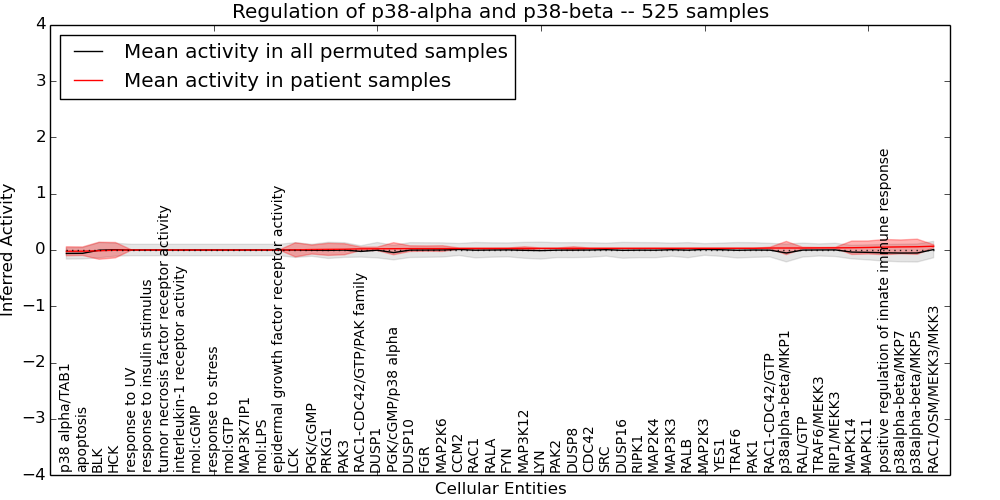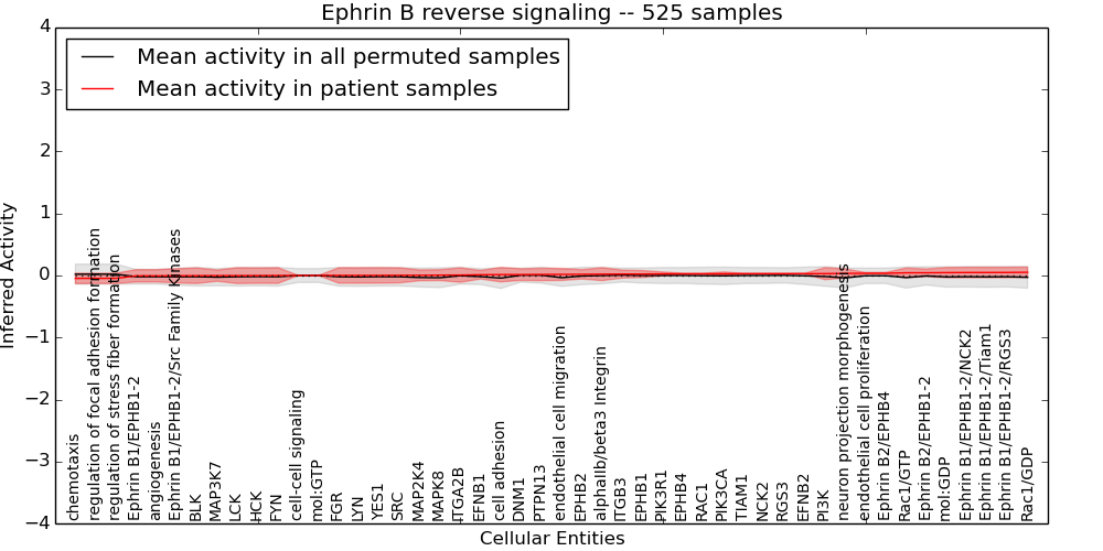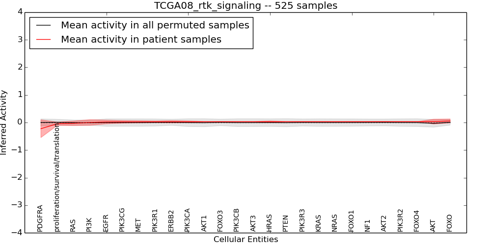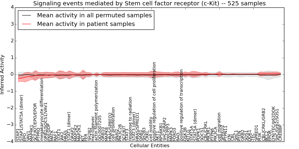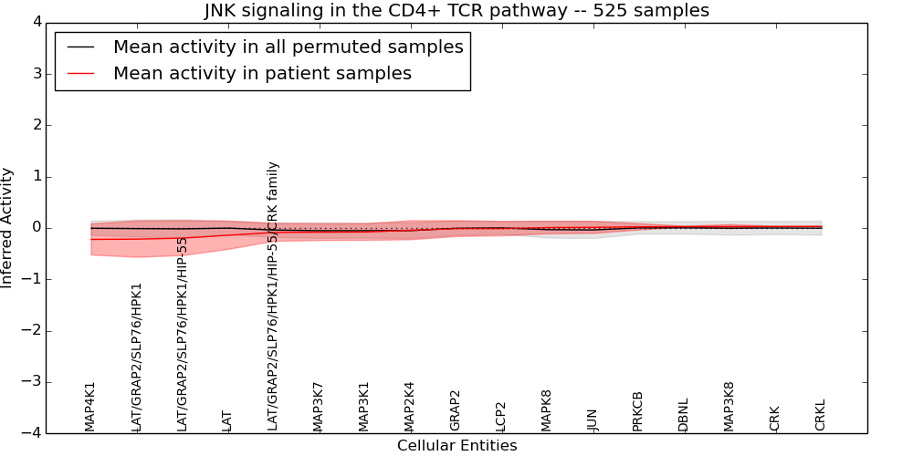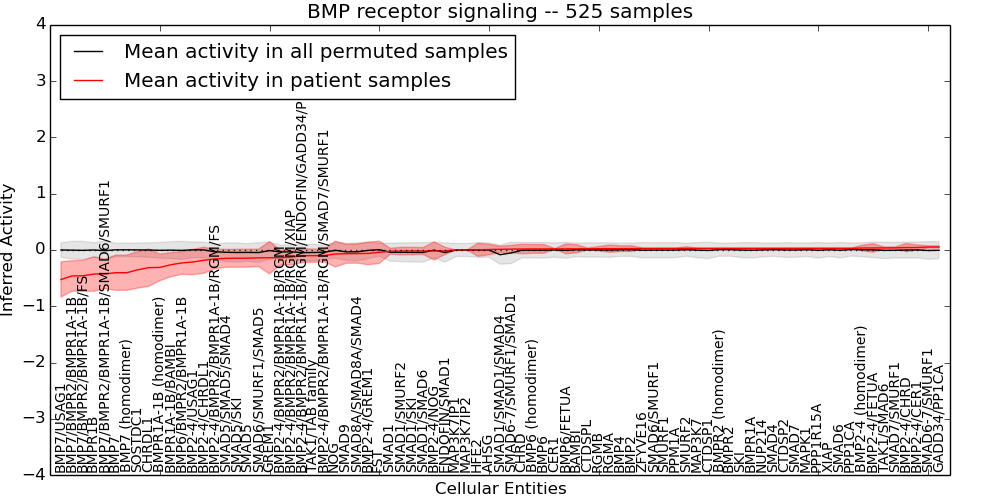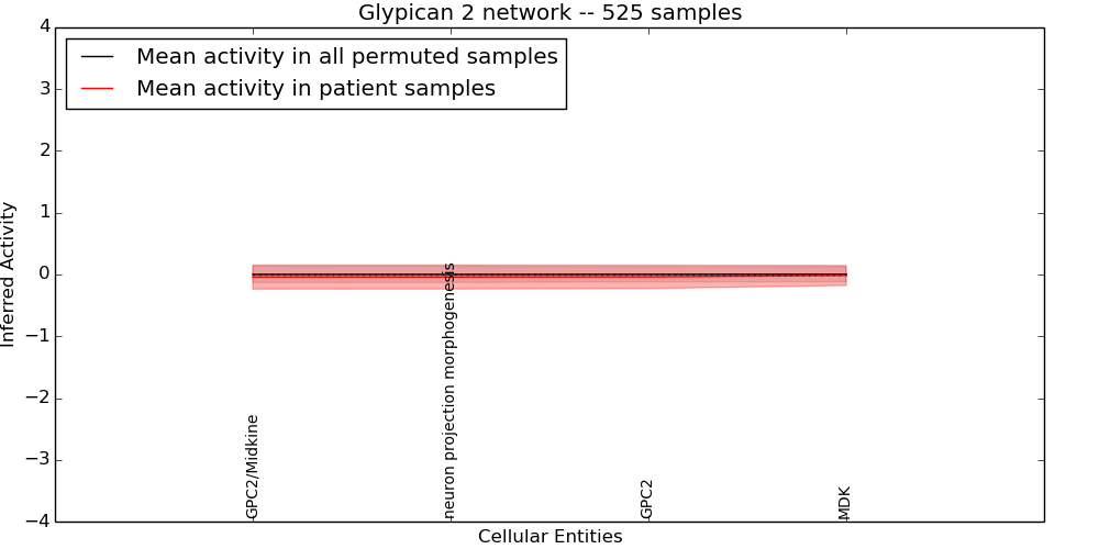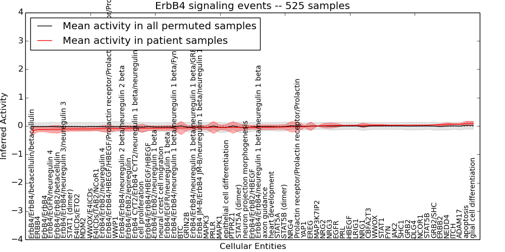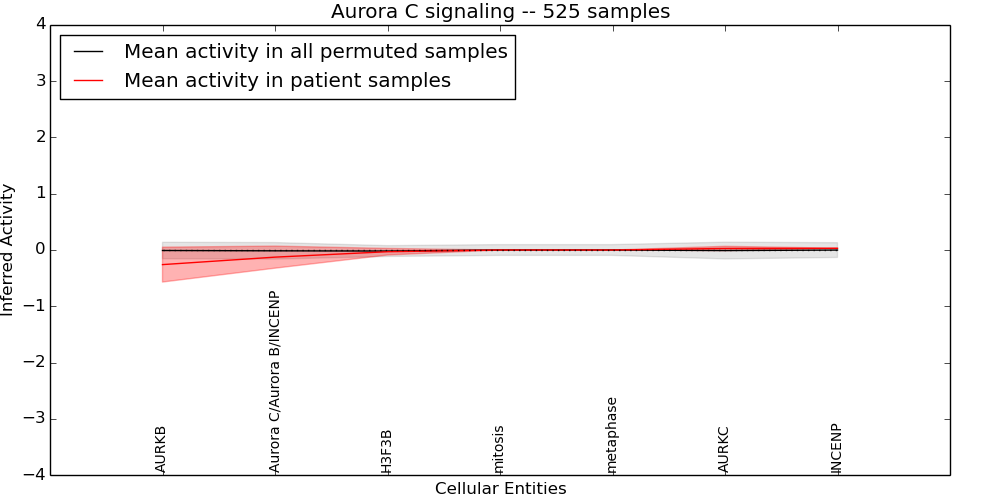 Figure S131. Get High-res Image This plot shows pathway concept perturbations across all samples against a permutation model. The concepts along the x-axis are sorted by lowest to highest mean activity for the real patient samples. Mean inferred activities are plotted along the y-axis as a colored band showing the average level and one standard deviation range. Real samples are shown in red and permuted samples in black.