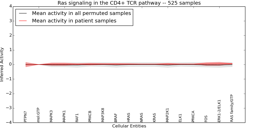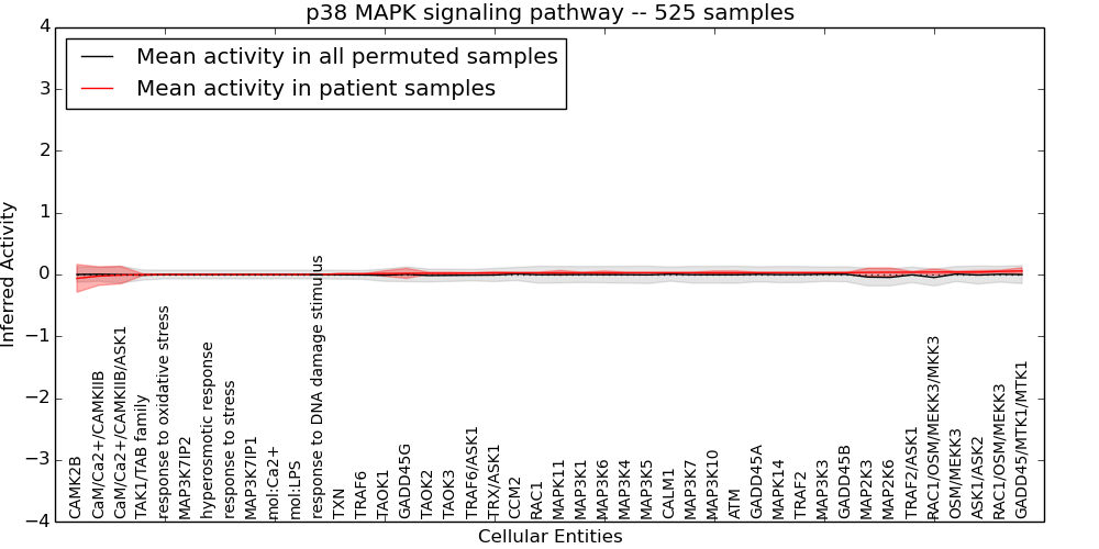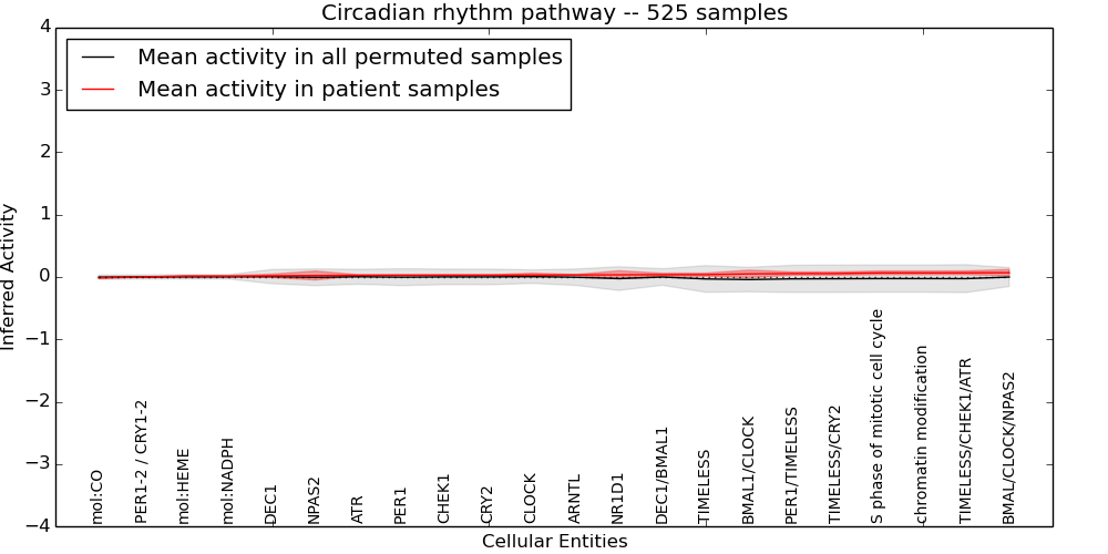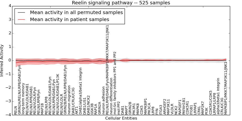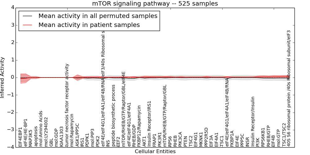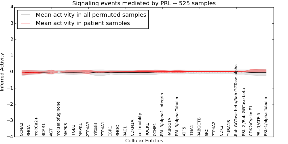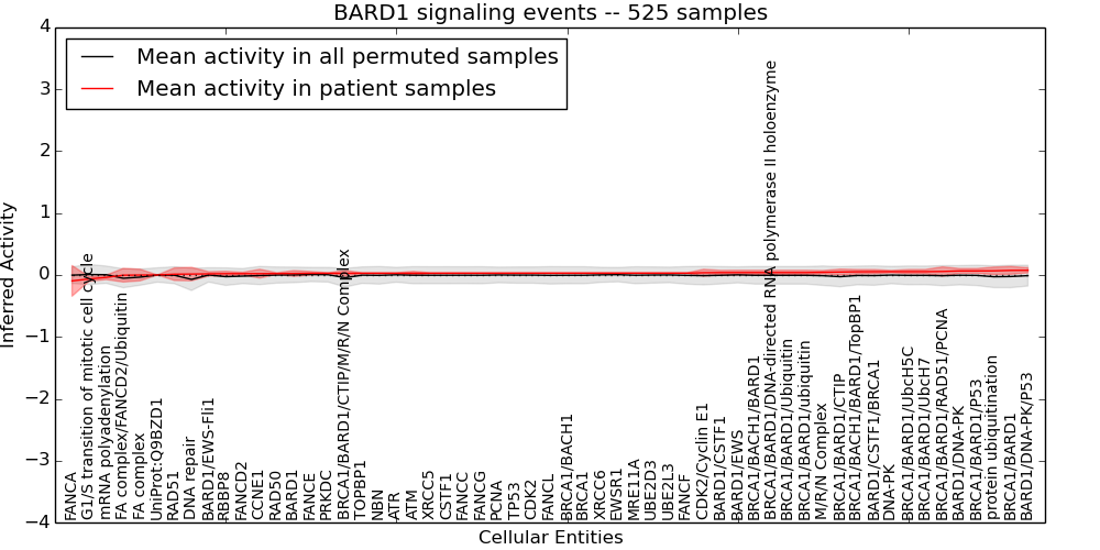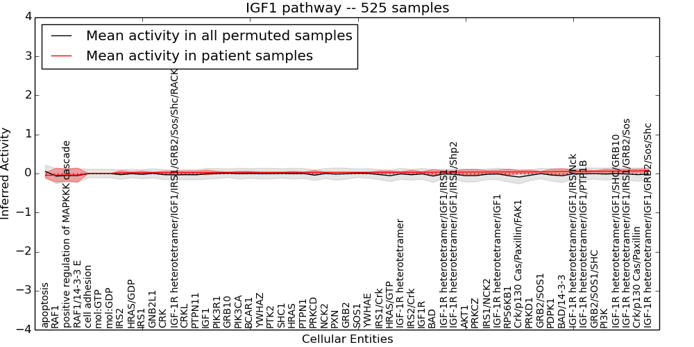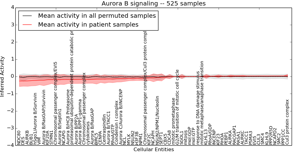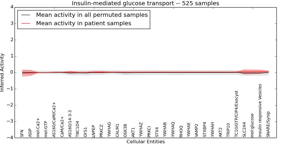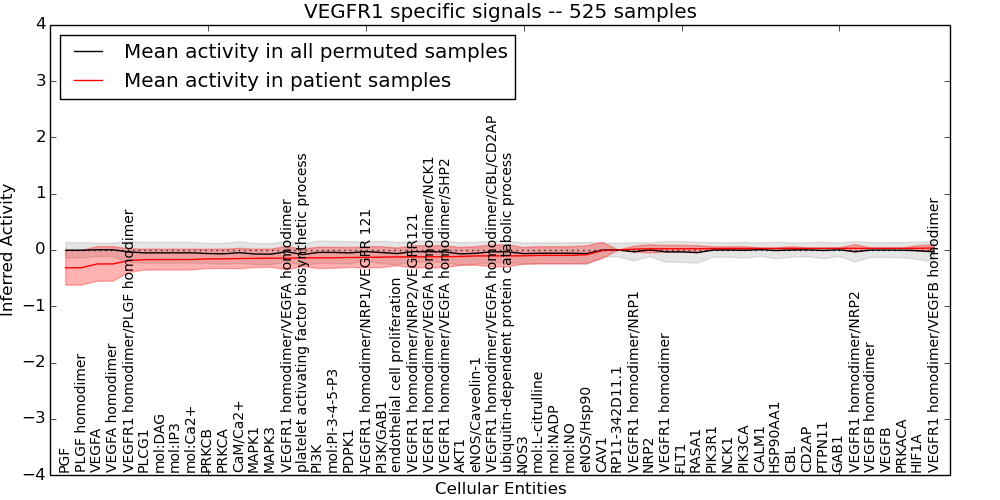 Figure S131. Get High-res Image This plot shows pathway concept perturbations across all samples against a permutation model. The concepts along the x-axis are sorted by lowest to highest mean activity for the real patient samples. Mean inferred activities are plotted along the y-axis as a colored band showing the average level and one standard deviation range. Real samples are shown in red and permuted samples in black.