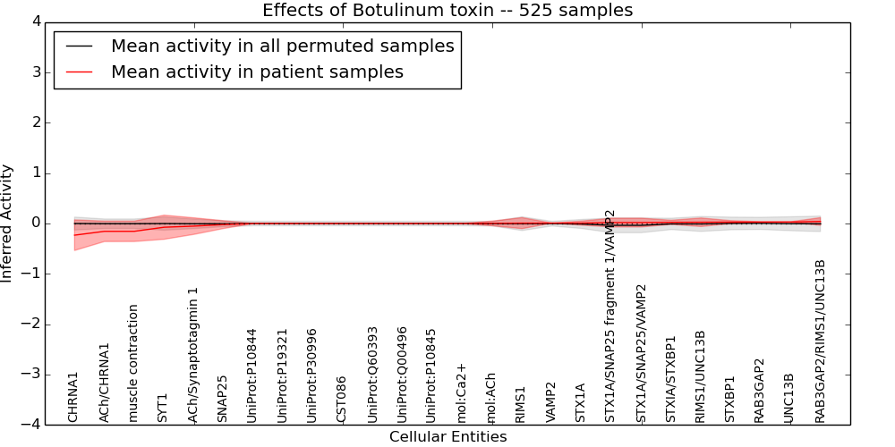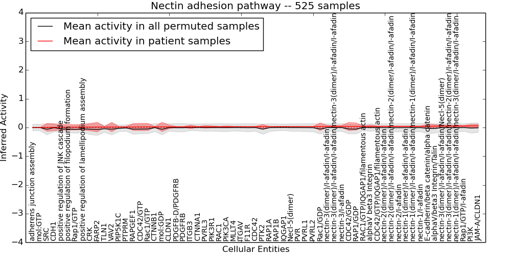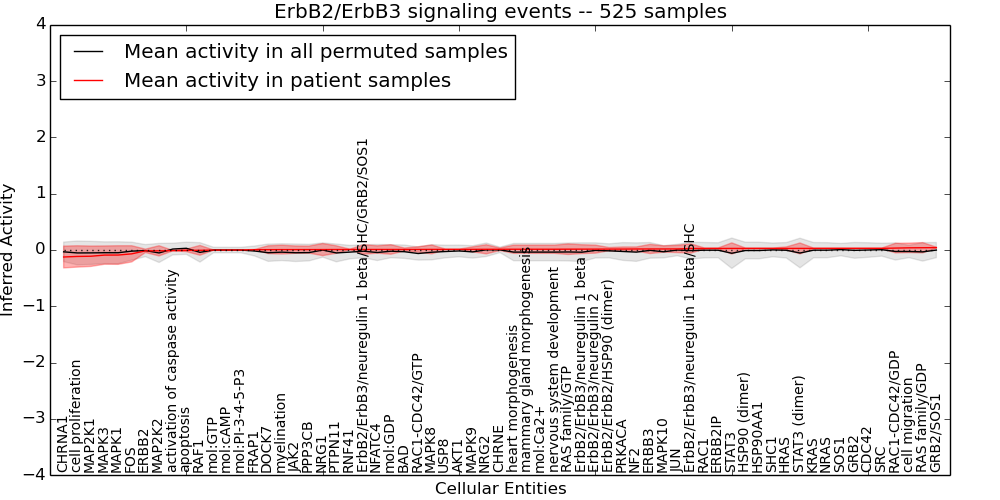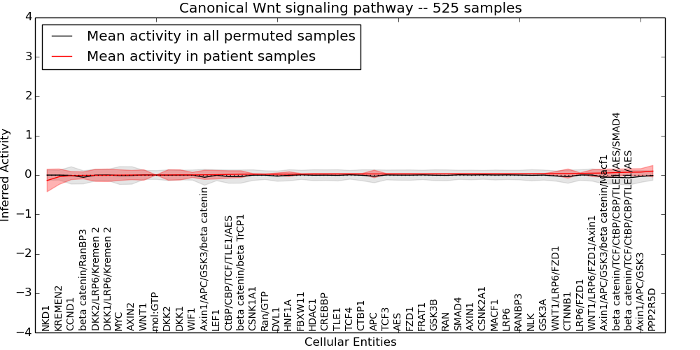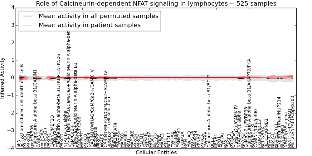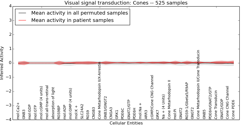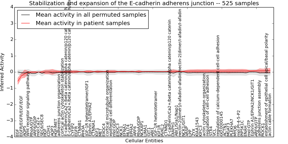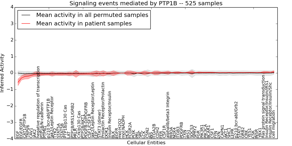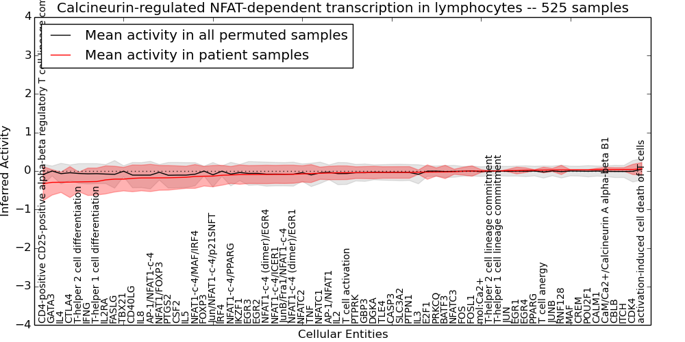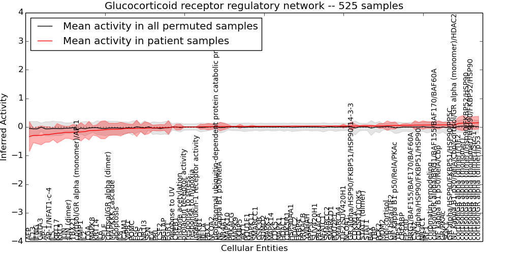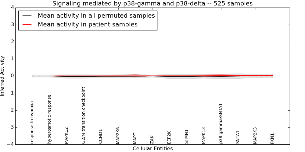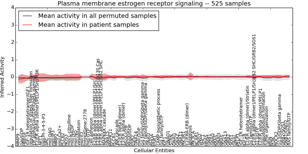 Figure S131. Get High-res Image This plot shows pathway concept perturbations across all samples against a permutation model. The concepts along the x-axis are sorted by lowest to highest mean activity for the real patient samples. Mean inferred activities are plotted along the y-axis as a colored band showing the average level and one standard deviation range. Real samples are shown in red and permuted samples in black.