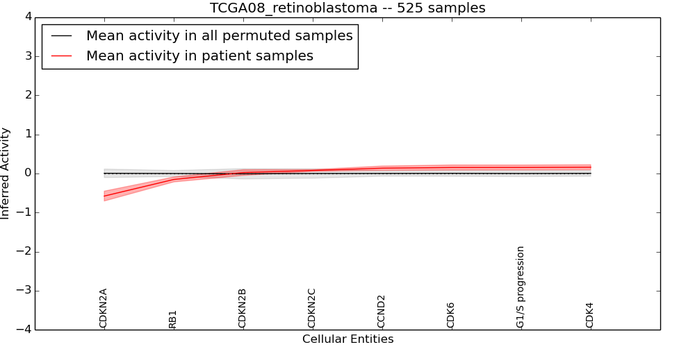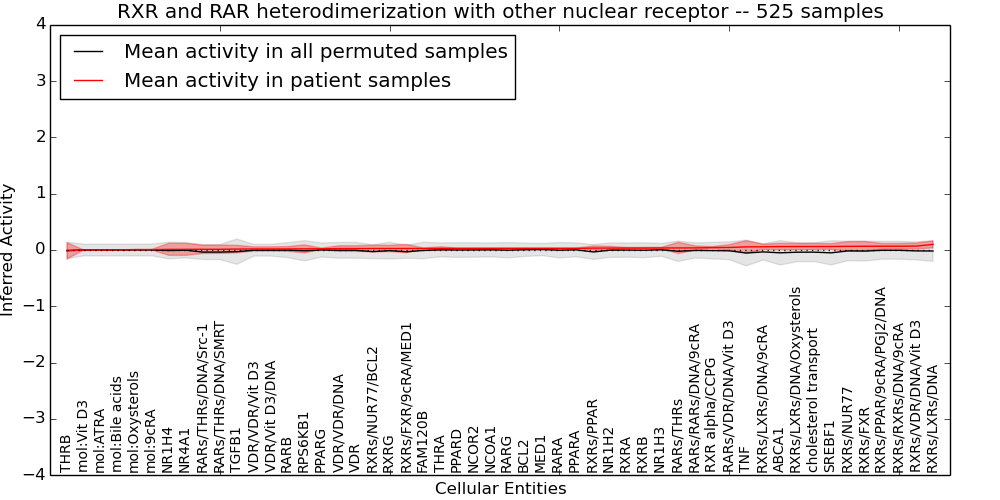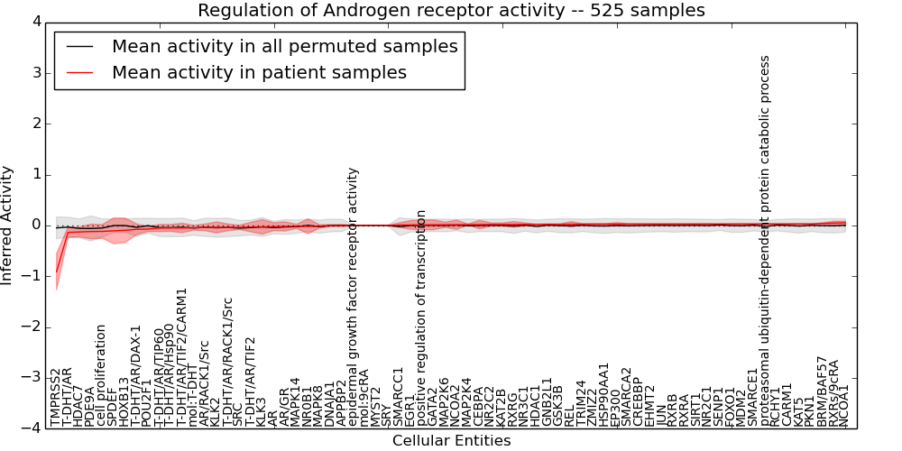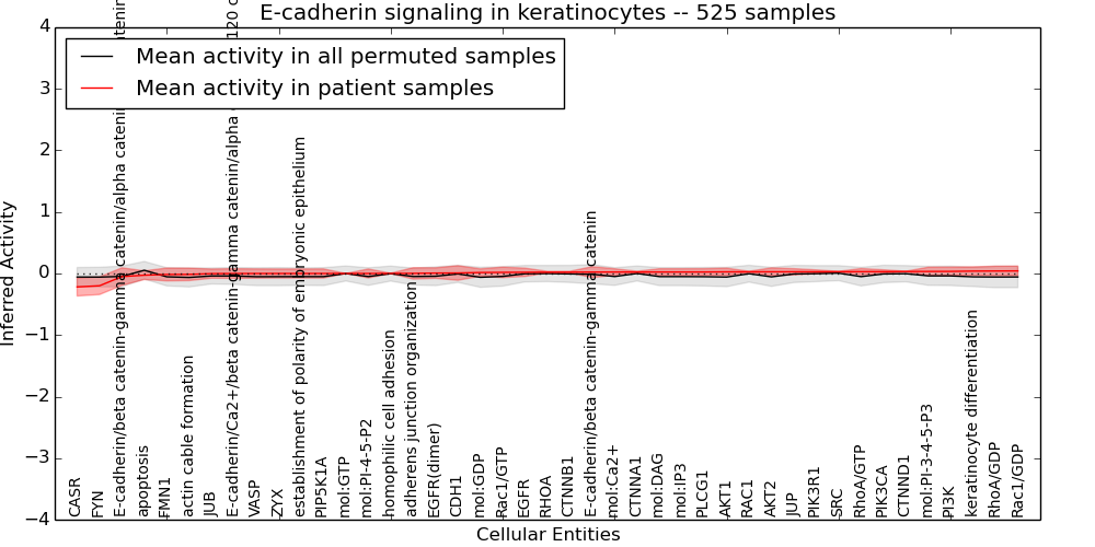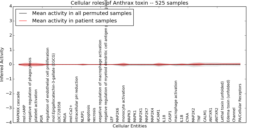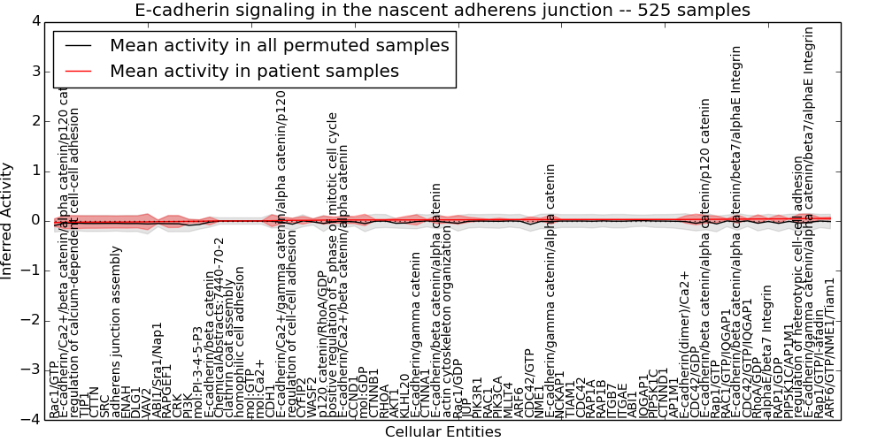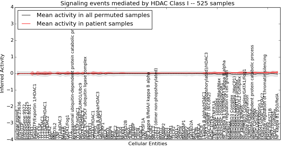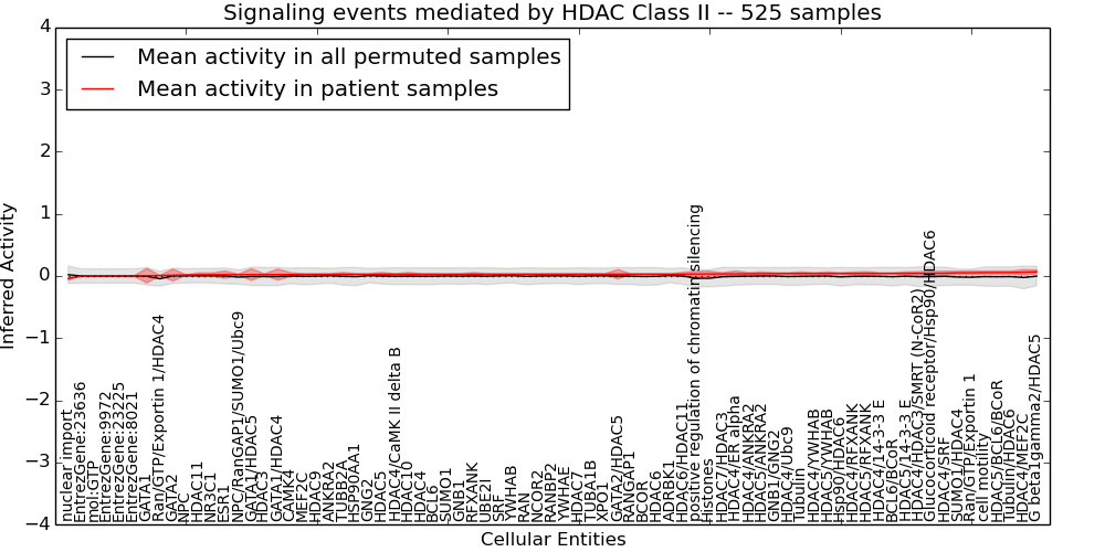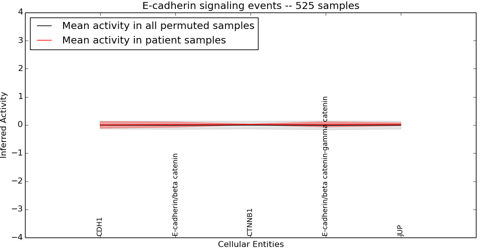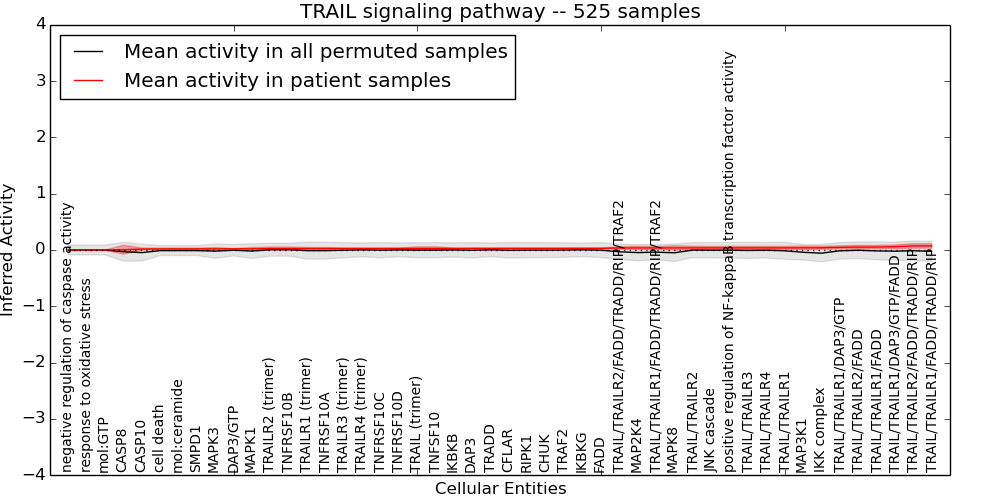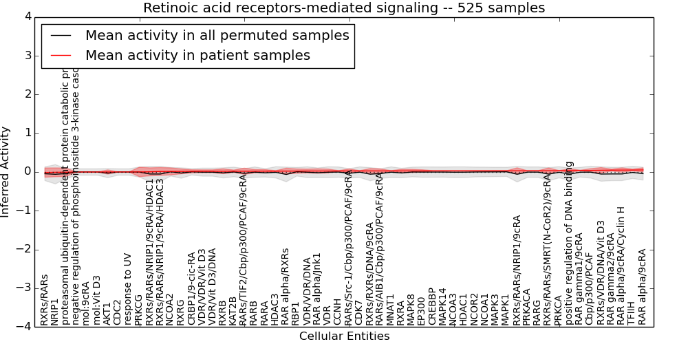 Figure S131. Get High-res Image This plot shows pathway concept perturbations across all samples against a permutation model. The concepts along the x-axis are sorted by lowest to highest mean activity for the real patient samples. Mean inferred activities are plotted along the y-axis as a colored band showing the average level and one standard deviation range. Real samples are shown in red and permuted samples in black.