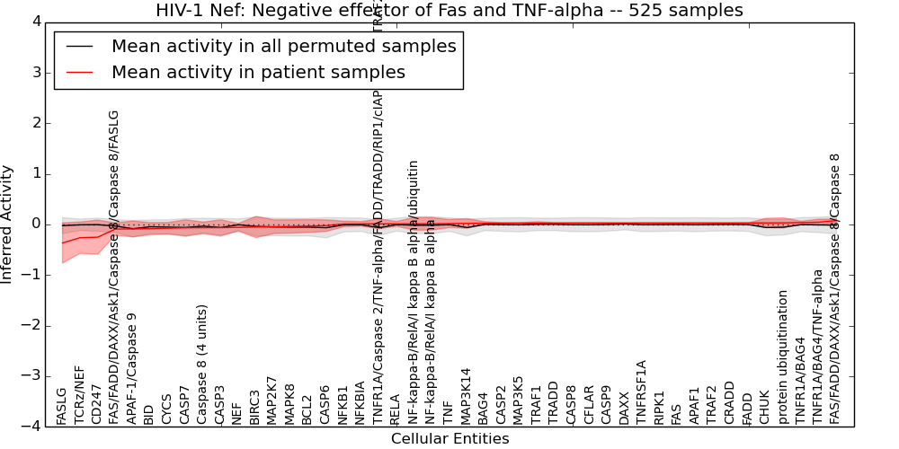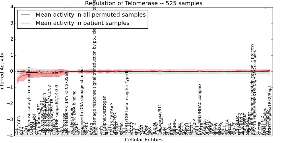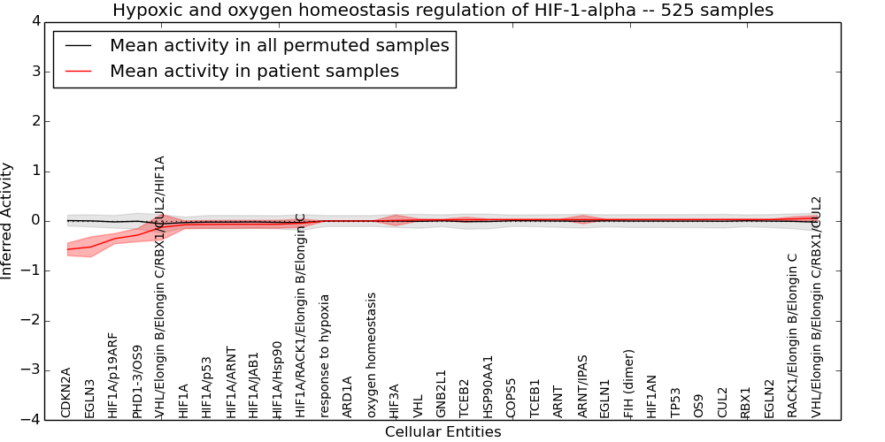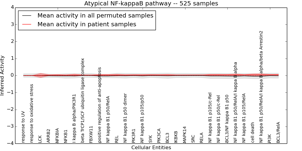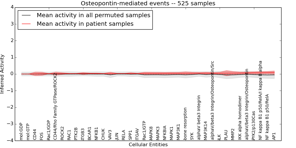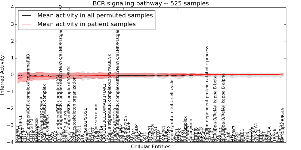 Figure S130. Get High-res Image This plot shows pathway concept perturbations across all samples against a permutation model. The concepts along the x-axis are sorted by lowest to highest mean activity for the real patient samples. Mean inferred activities are plotted along the y-axis as a colored band showing the average level and one standard deviation range. Real samples are shown in red and permuted samples in black.