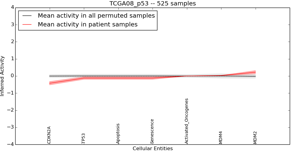 The significance of the IPL obtained for each concept in each patient sample is assessed using a permutation analysis. Importantly, the permutation analysis preserves data tuples so as to preserve any implicit correlations between the different data modalities. For example, genes that are deleted have concomitantly lower expression levels. Preserving the copy number and expression pairs therefore retains this data property. The simulation therefore makes "null samples" by permuting data tuples across all of the genes in the genome so that each gene in a null sample is associated with a random tuple of another gene with equal probability. This approach has the added benefit of preserving the pathway structure so that every observed IPL can be compared to a distribution of random IPLs derived from exactly the same interaction context. PARADIGM inferences are then obtained for 1000 "null" patients and serve as a background distribution to contrast the observed IPLs against. Pathway concepts are excluded from further analysis if they did not obtain a minimum IPL of 0.5 in any patient sample both observed or simulated.