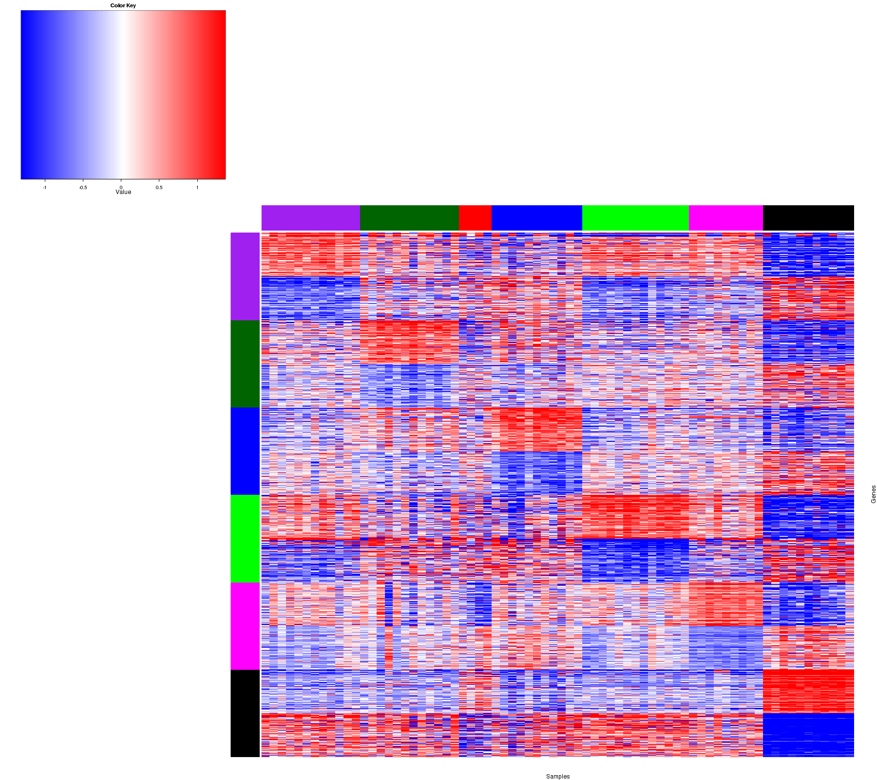 Figure 1. Get High-res Image Samples were separated into 7 clusters. Shown are 72 samples and 1800 marker genes. The color bar of the row indicates the marker genes for the corresponding cluster.