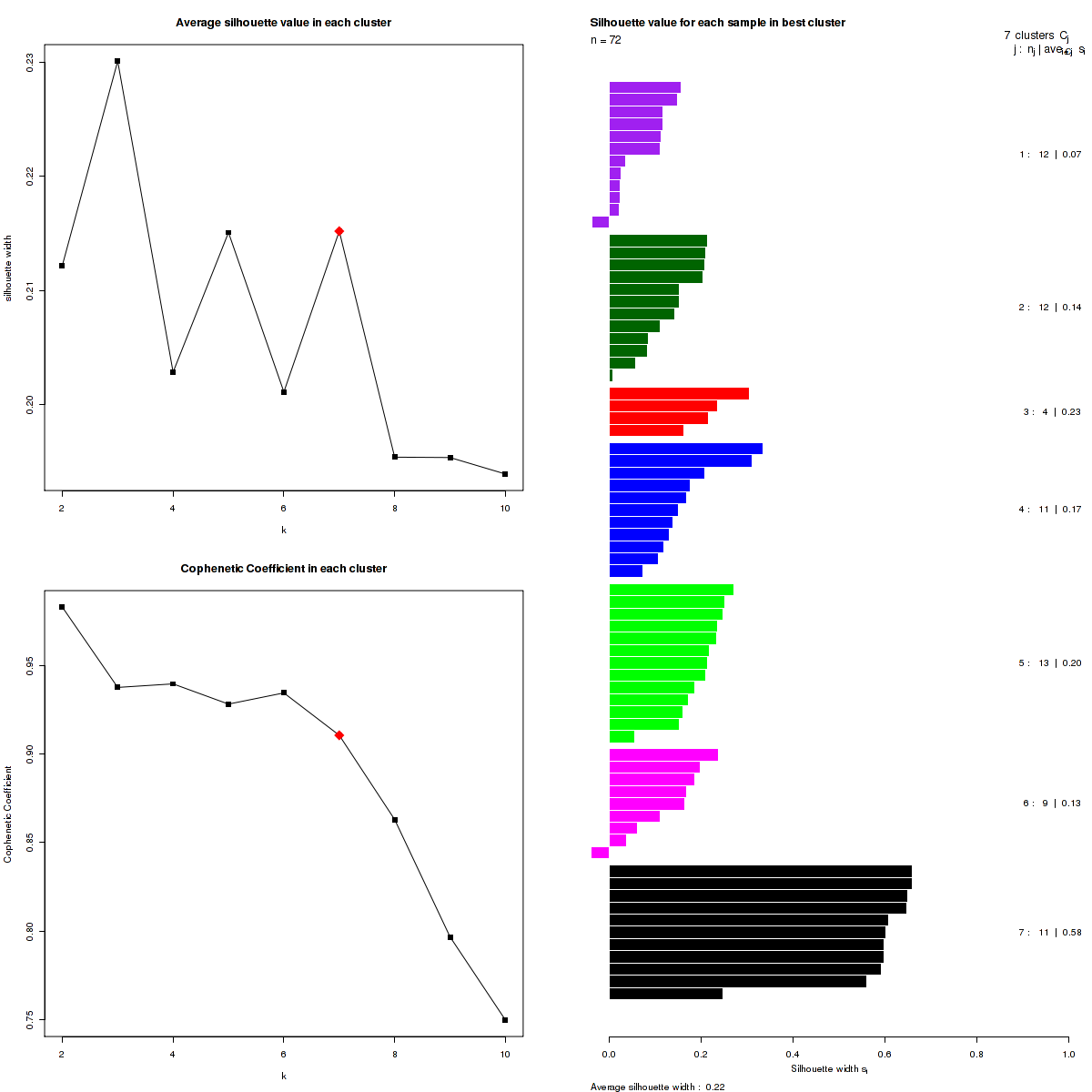Figure 3. Get High-res Image The silhouette width was calculated for each sample and each value of k. The left upper panel shows the average silhouette width across all samples for each tested k (left upper panel). The left lower panel shows the Cophenetic Correlation Coefficients for each tested k. The right panel shows assignments of clusters to samples and the k silhouette width of each sample for the most robust clustering.