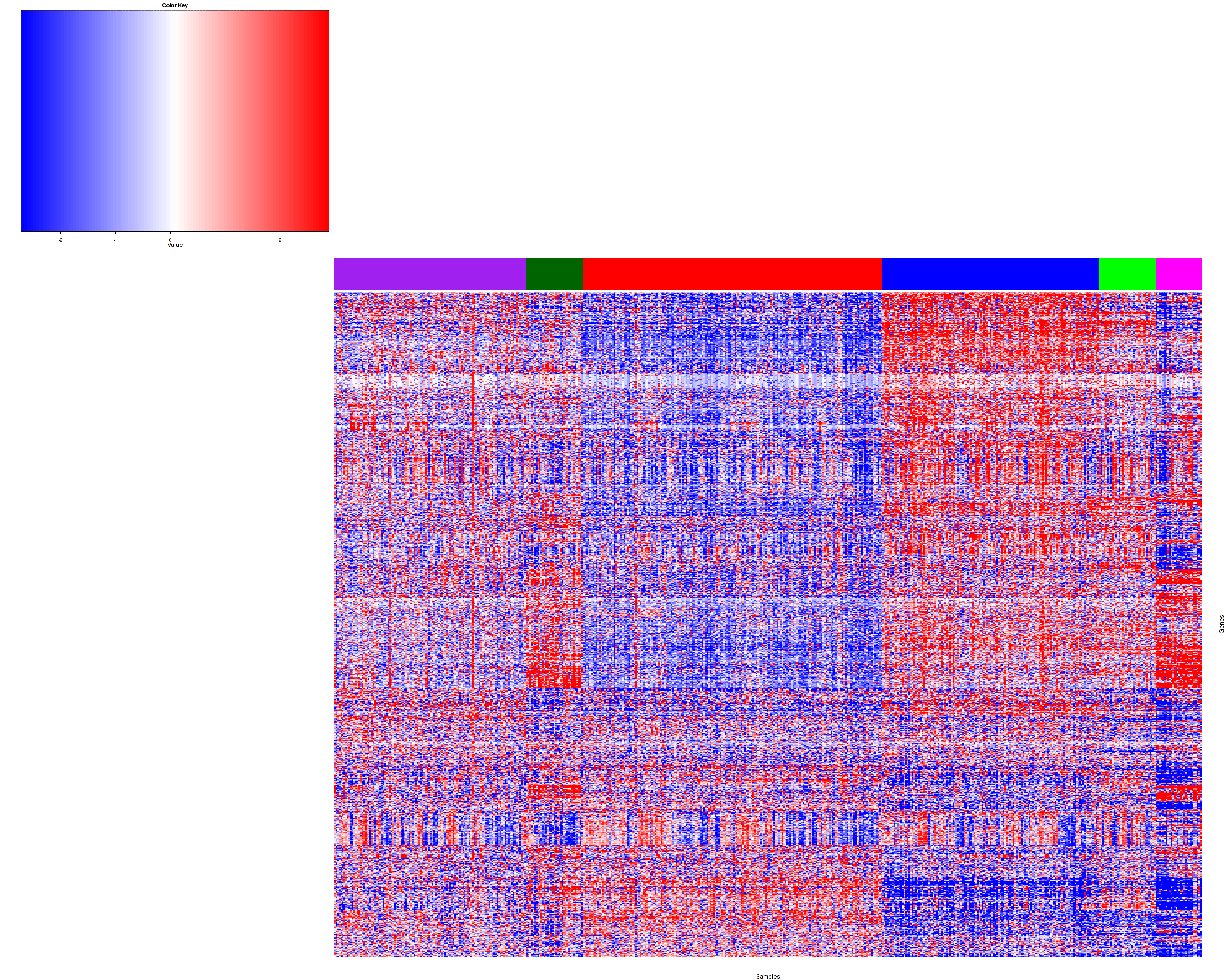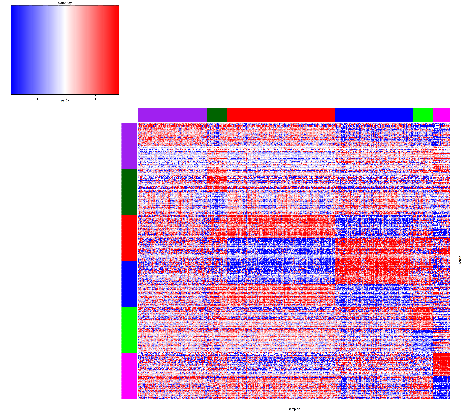 Figure 1. Get High-res Image Samples were separated into 6 clusters. Shown are 533 samples and 1800 marker genes. The color bar of the row indicates the marker genes for the corresponding cluster.