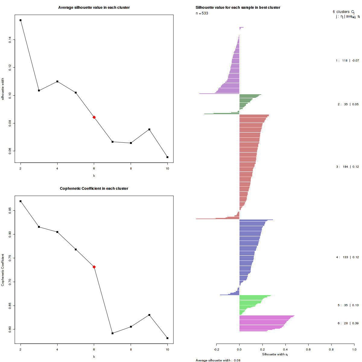 Figure 3. Get High-res Image The silhouette width was calculated for each sample and each value of k. The left upper panel shows the average silhouette width across all samples for each tested k (left upper panel). The left lower panel shows the Cophenetic Correlation Coefficients for each tested k. The right panel shows assignments of clusters to samples and the k silhouette width of each sample for the most robust clustering.
