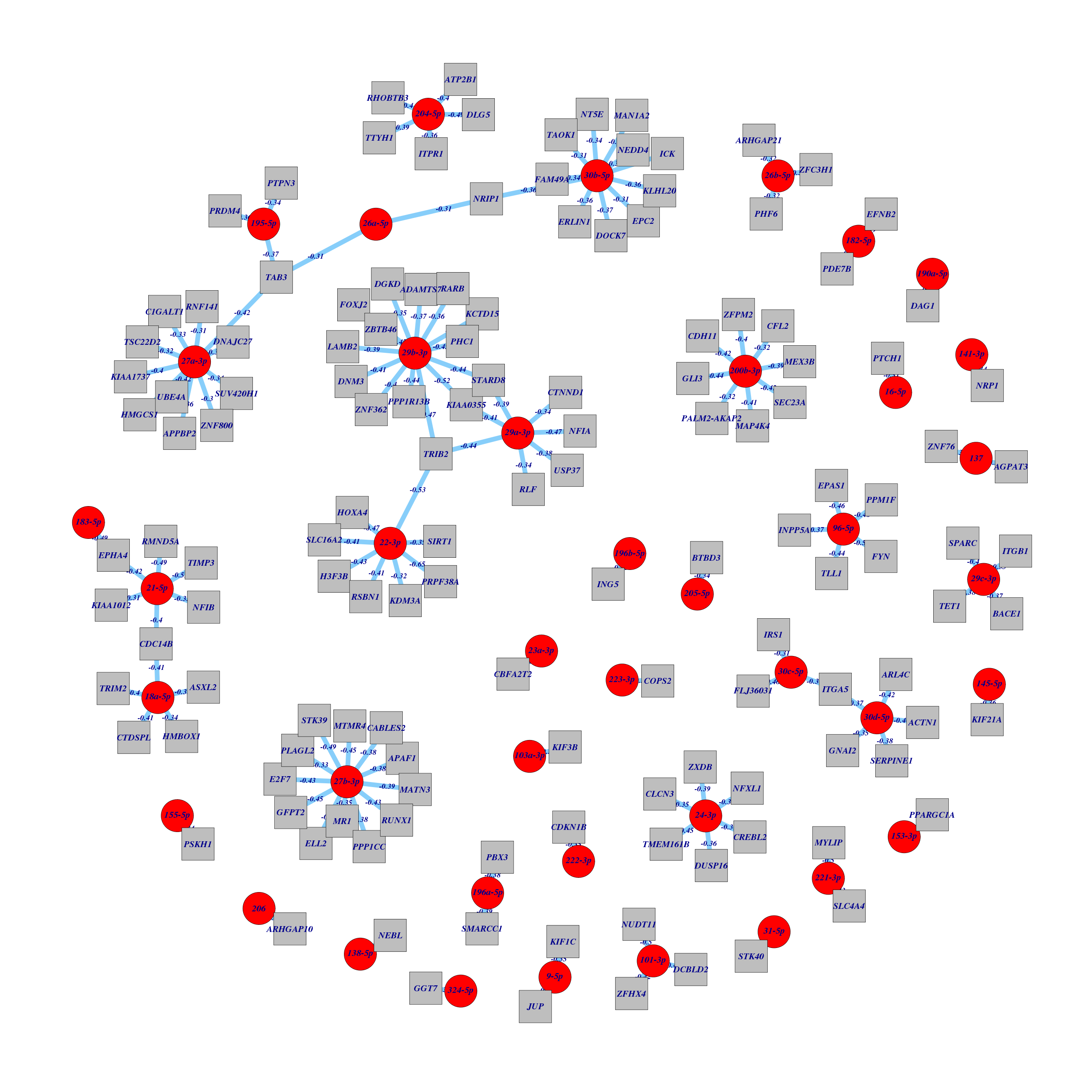 Figure 1. Get High-res Image All miR hubs with their strong anti-correlated genes and predicted interactions in three sequence prediction databases.