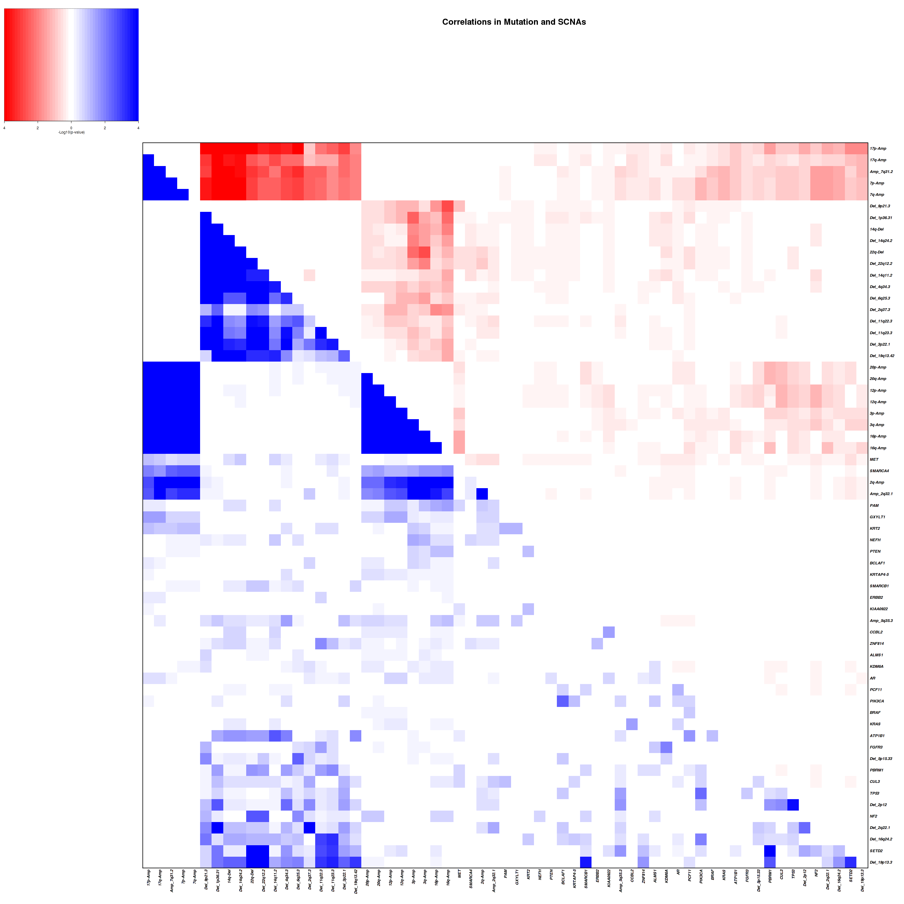 Figure 4. Get High-res Image Co-occurring and mutually-exclusive pairs for all copy number and mutation events. Blue means two events are co-occurring and red means two events are mutually-exclusive.
