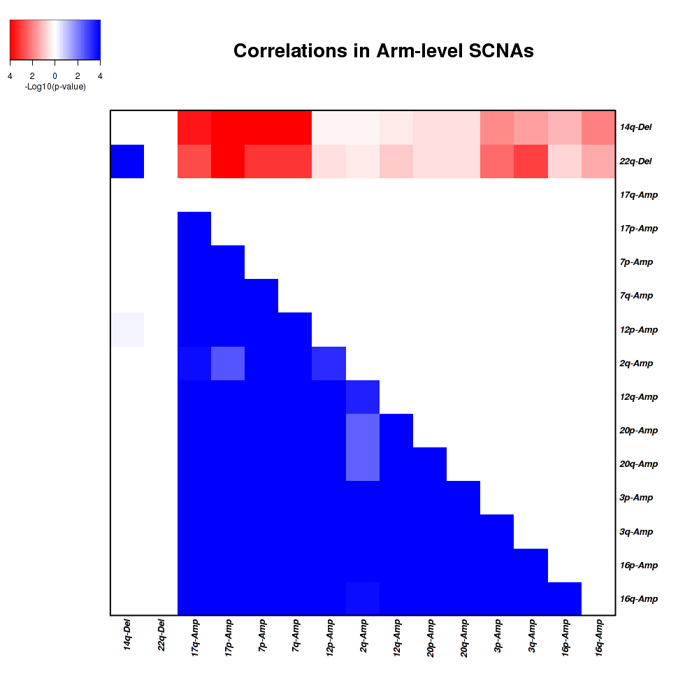 Figure 1. Get High-res Image Co-occurring and mutually-exclusive pairs for copy number variations of arm level events. Blue means two events are co-occurring and red means two events are mutually-exclusive.
