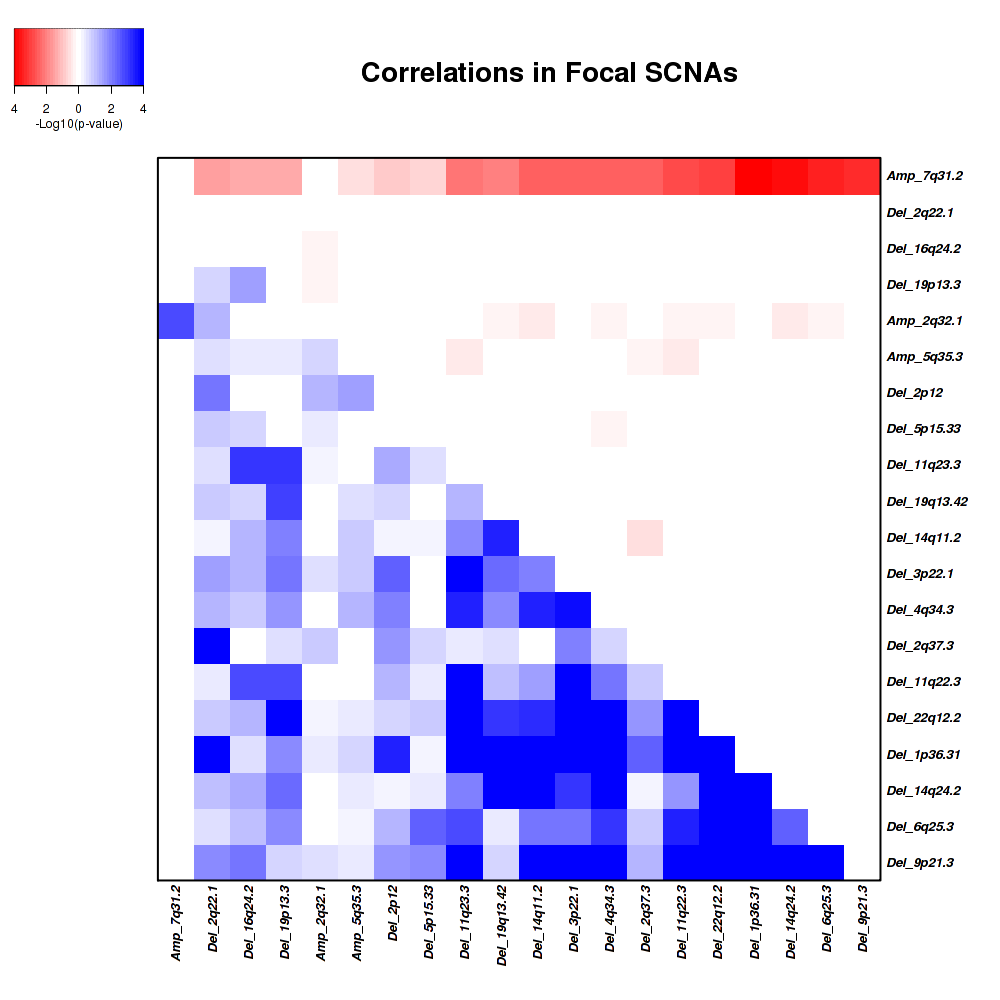Figure 2. Get High-res Image Co-occurring and mutually-exclusive pairs for copy number variations of focal events. Blue means two events are co-occurring and red means two events are mutually-exclusive.