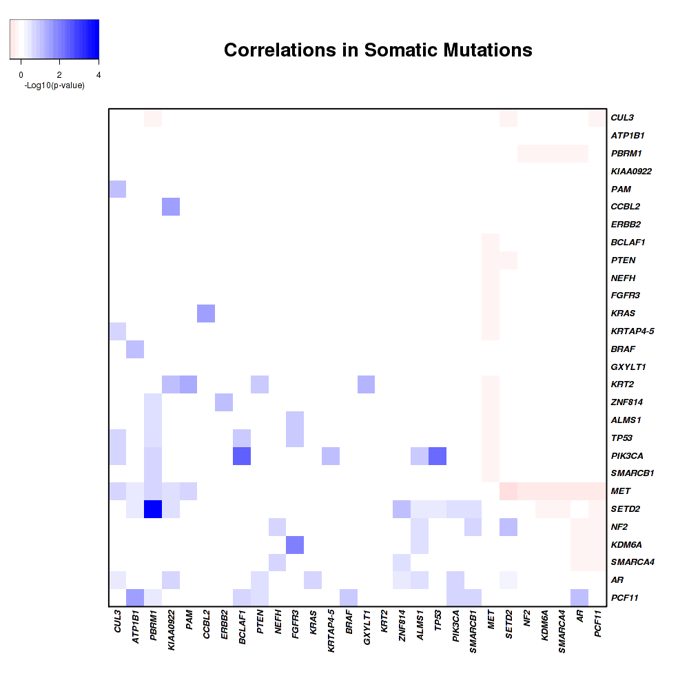 Figure 3. Get High-res Image Co-occurring and mutually-exclusive pairs for significantly mutated genes. Blue means two events are co-occurring and red means two events are mutually-exclusive.