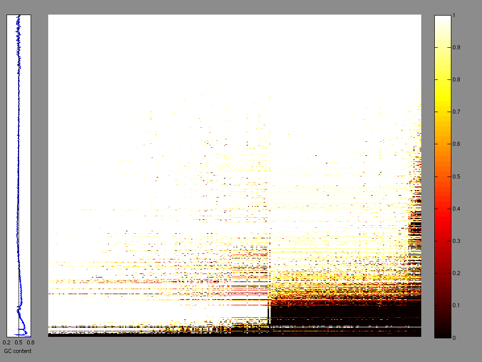 The x axis represents the samples. The y axis represents the exons, one row per exon, and they are sorted by average coverage across samples. For exons with exactly the same average coverage, they are sorted next by the %GC of the exon. (The secondary sort is especially useful for the zero-coverage exons at the bottom). If the figure is unpopulated, then full coverage is assumed (e.g. MutSig CV doesn't use WIGs and assumes full coverage).