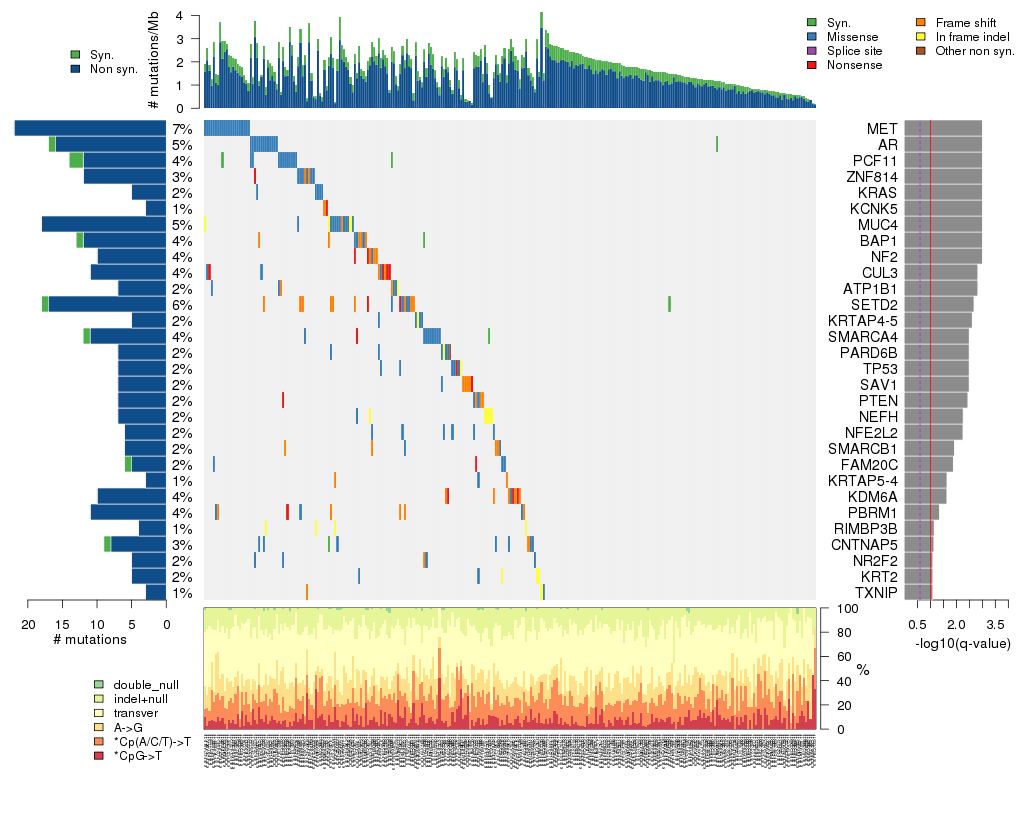 Figure 5. Get High-res Image The matrix in the center of the figure represents individual mutations in patient samples, color-coded by type of mutation, for the significantly mutated genes. The rate of synonymous and non-synonymous mutations is displayed at the top of the matrix. The barplot on the left of the matrix shows the number of mutations in each gene. The percentages represent the fraction of tumors with at least one mutation in the specified gene. The barplot to the right of the matrix displays the q-values for the most significantly mutated genes. The purple boxplots below the matrix (only displayed if required columns are present in the provided MAF) represent the distributions of allelic fractions observed in each sample. The plot at the bottom represents the base substitution distribution of individual samples, using the same categories that were used to calculate significance.
