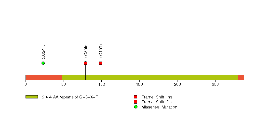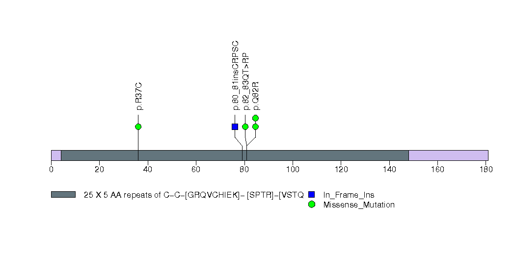 Figure S13. This figure depicts the distribution of mutations and mutation types across the KRTAP4-5 significant gene.