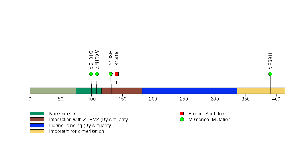 Figure S28. This figure depicts the distribution of mutations and mutation types across the NR2F2 significant gene.