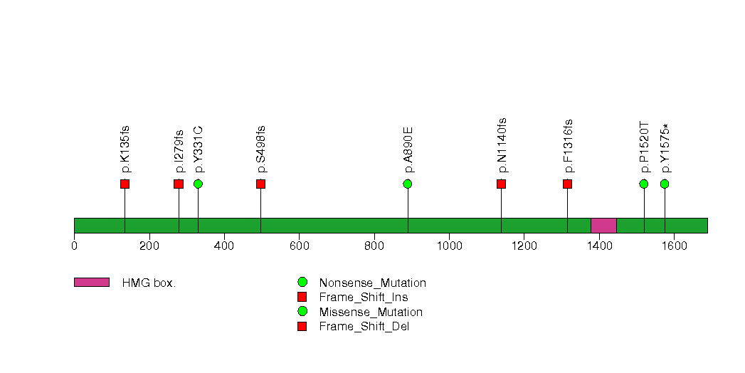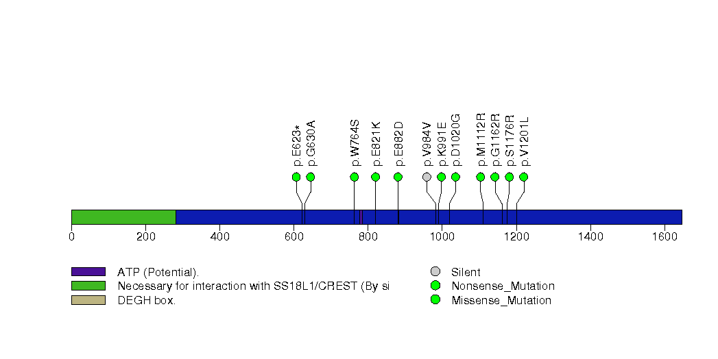 Figure S14. This figure depicts the distribution of mutations and mutation types across the SMARCA4 significant gene.