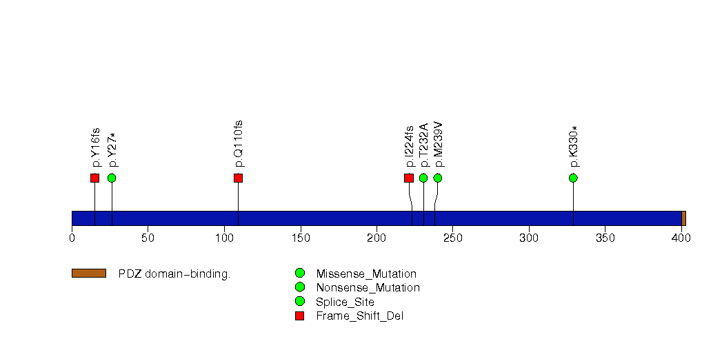 Figure S17. This figure depicts the distribution of mutations and mutation types across the SAV1 significant gene.