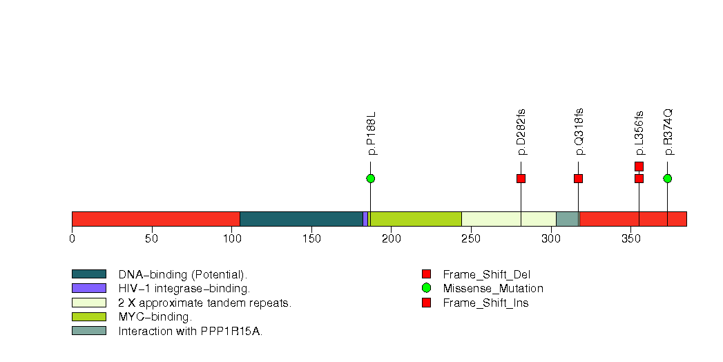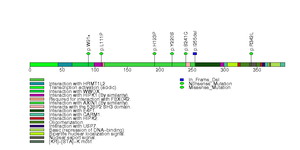 Figure S16. This figure depicts the distribution of mutations and mutation types across the TP53 significant gene.