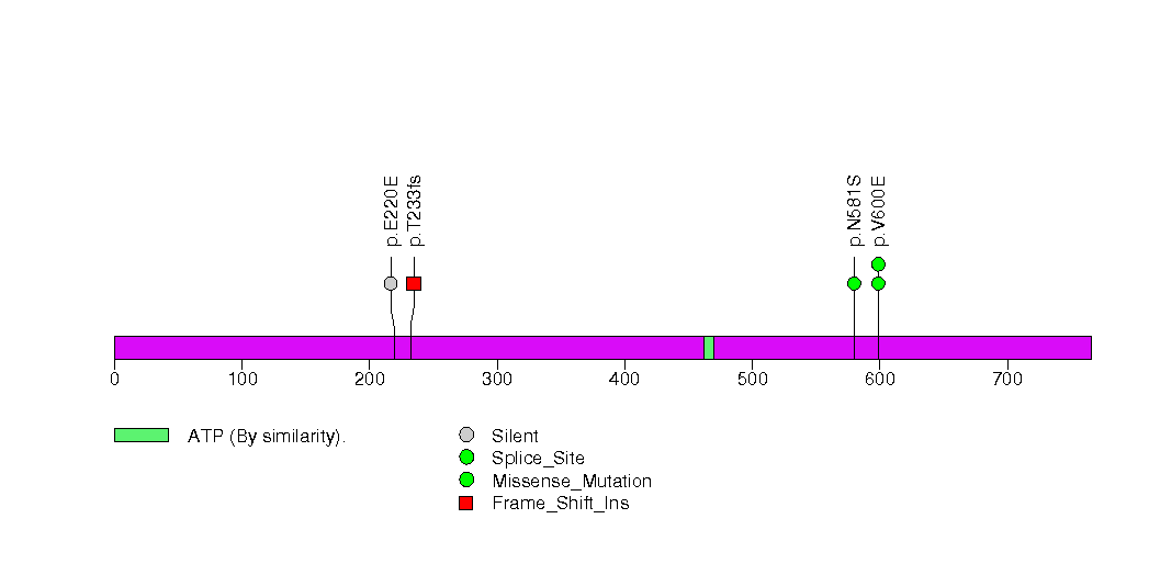 Figure S16. This figure depicts the distribution of mutations and mutation types across the BRAF significant gene.