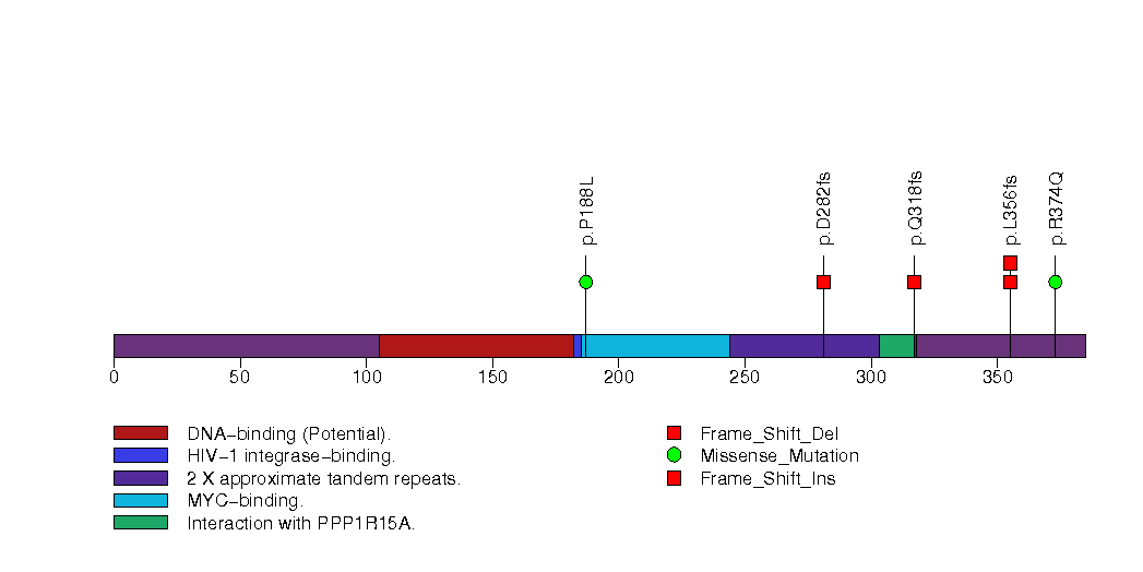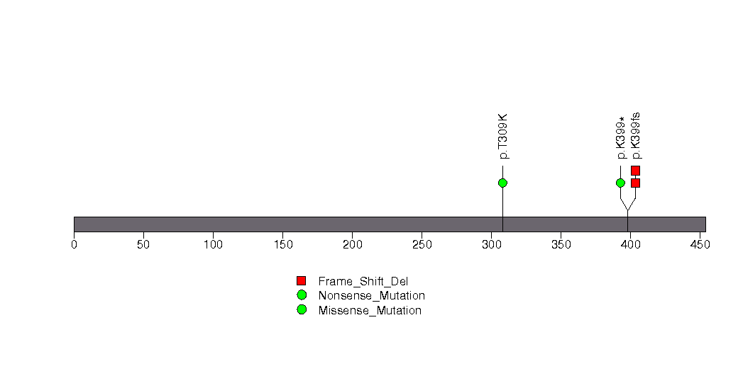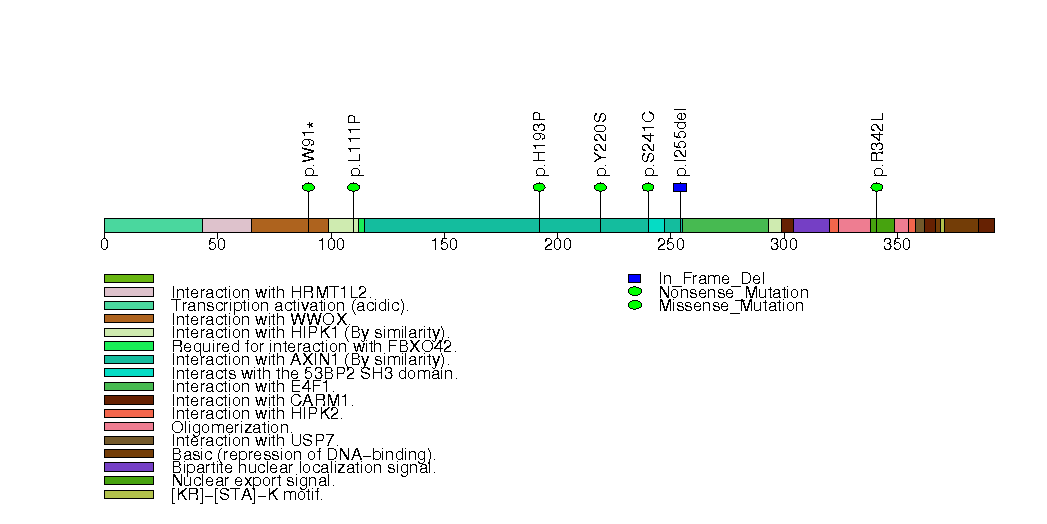 Figure S14. This figure depicts the distribution of mutations and mutation types across the TP53 significant gene.