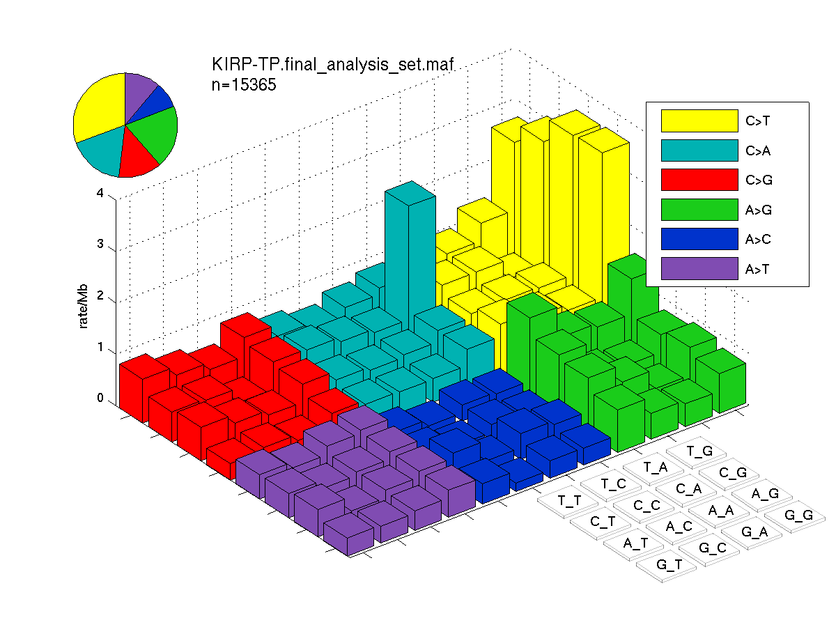 Figure 1. Get High-res Image SNV Mutation rate lego plot for entire set. Each bin is normalized by base coverage for that bin. Colors represent the six SNV types on the upper right. The three-base context for each mutation is labeled in the 4x4 legend on the lower right. The fractional breakdown of SNV counts is shown in the pie chart on the upper left. If this figure is blank, not enough information was provided in the MAF to generate it.