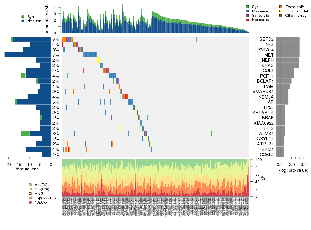 Figure 3. Get High-res Image The matrix in the center of the figure represents individual mutations in patient samples, color-coded by type of mutation, for the significantly mutated genes. The rate of synonymous and non-synonymous mutations is displayed at the top of the matrix. The barplot on the left of the matrix shows the number of mutations in each gene. The percentages represent the fraction of tumors with at least one mutation in the specified gene. The barplot to the right of the matrix displays the q-values for the most significantly mutated genes. The purple boxplots below the matrix (only displayed if required columns are present in the provided MAF) represent the distributions of allelic fractions observed in each sample. The plot at the bottom represents the base substitution distribution of individual samples, using the same categories that were used to calculate significance.