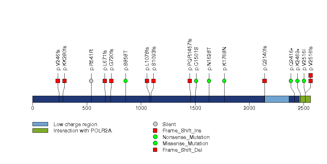Figure S1. This figure depicts the distribution of mutations and mutation types across the SETD2 significant gene.