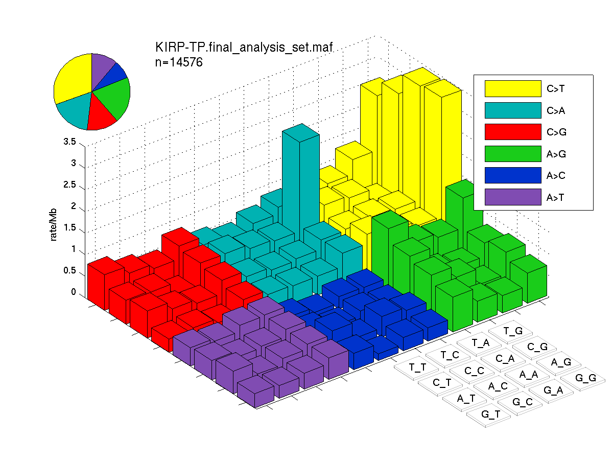 Figure 3. Get High-res Image SNV Mutation rate lego plot for entire set. Each bin is normalized by base coverage for that bin. Colors represent the six SNV types on the upper right. The three-base context for each mutation is labeled in the 4x4 legend on the lower right. The fractional breakdown of SNV counts is shown in the pie chart on the upper left. If this figure is blank, not enough information was provided in the MAF to generate it.