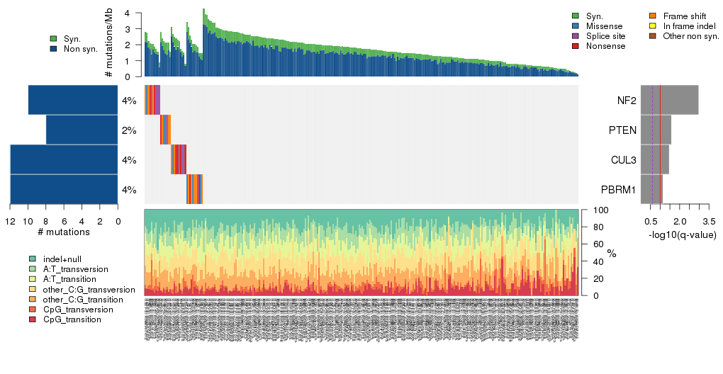 Figure 5. Get High-res Image The matrix in the center of the figure represents individual mutations in patient samples, color-coded by type of mutation, for the significantly mutated genes. The rate of synonymous and non-synonymous mutations is displayed at the top of the matrix. The barplot on the left of the matrix shows the number of mutations in each gene. The percentages represent the fraction of tumors with at least one mutation in the specified gene. The barplot to the right of the matrix displays the q-values for the most significantly mutated genes. The purple boxplots below the matrix (only displayed if required columns are present in the provided MAF) represent the distributions of allelic fractions observed in each sample. The plot at the bottom represents the base substitution distribution of individual samples, using the same categories that were used to calculate significance.