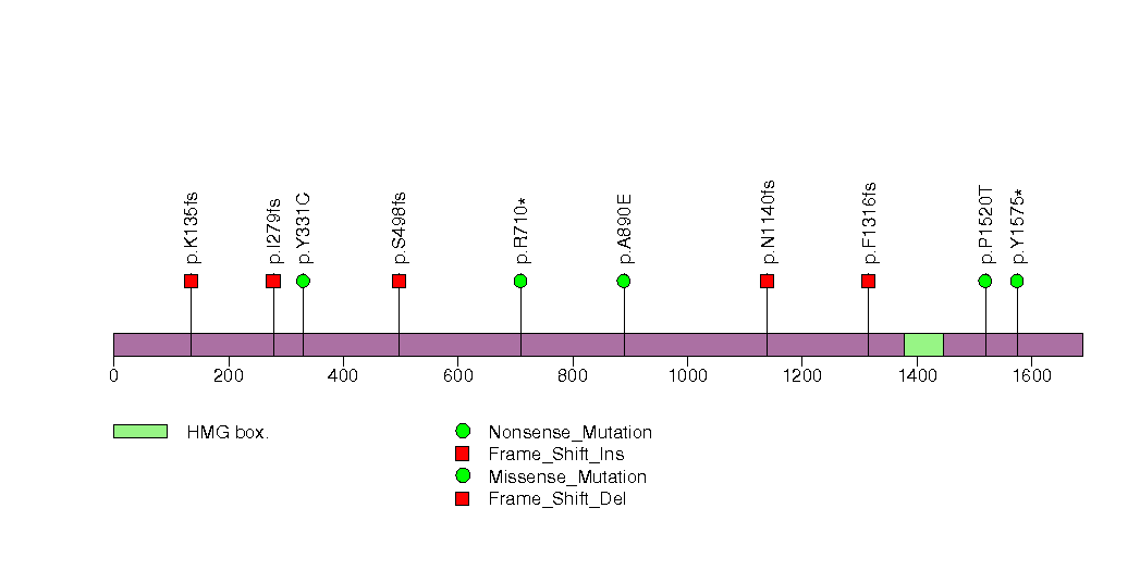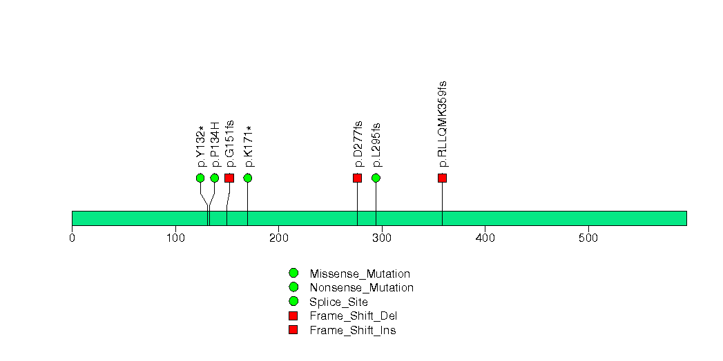 Figure S4. This figure depicts the distribution of mutations and mutation types across the PBRM1 significant gene.