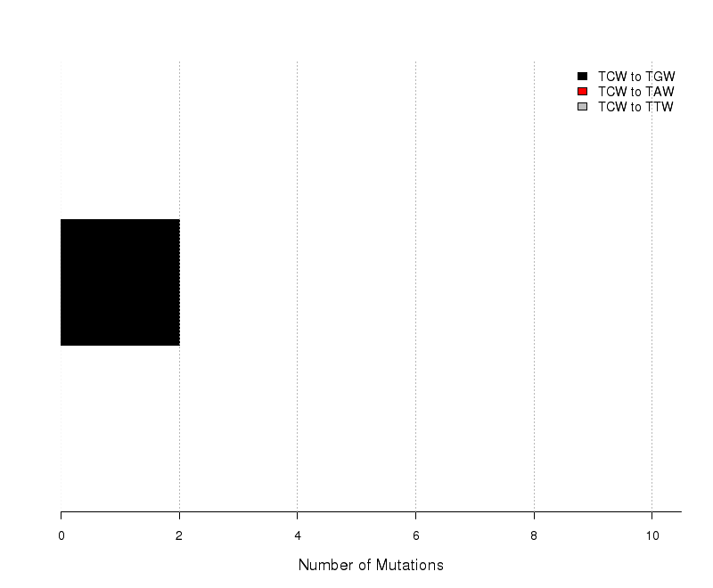 Figure 8. Get High-res Image The number of mutations categorized into three possible types of substitutions at the tCw motif (complementary mutations included) within C- or G-coordinated clusters. Numbers are calculated using the “Totals” row in the corresponding columns of the “*_sorted_sum_G_C_clusters.txt” file. Mutations caused by cytidine deamination in stretches of ssDNA caused by APOBEC mutagenesis are expected to be predominantly C-->T or C-->G with very few C-->A. Base substitution categories are shown within TCW context.