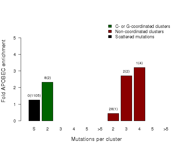 Fold enrichment of the APOBEC mutation signature in clusters of different sizes of two categories – C- or G-coordinated or non-coordinated as well as in non-clustered (scattered) mutations. Smaller clusters usually show less enrichment because they have a higher chance to be formed by random mutations that occurred in close vicinity to each other. Values above the bars display the total number of mutation clusters in each class and in parentheses the total numbers of APOBEC signature mutations in a category. Values for fold enrichment as well as mutation and mutation cluster counts are taken from the following output files which can be downloaded from firehose_get (https://confluence.broadinstitute.org/display/GDAC/Download):