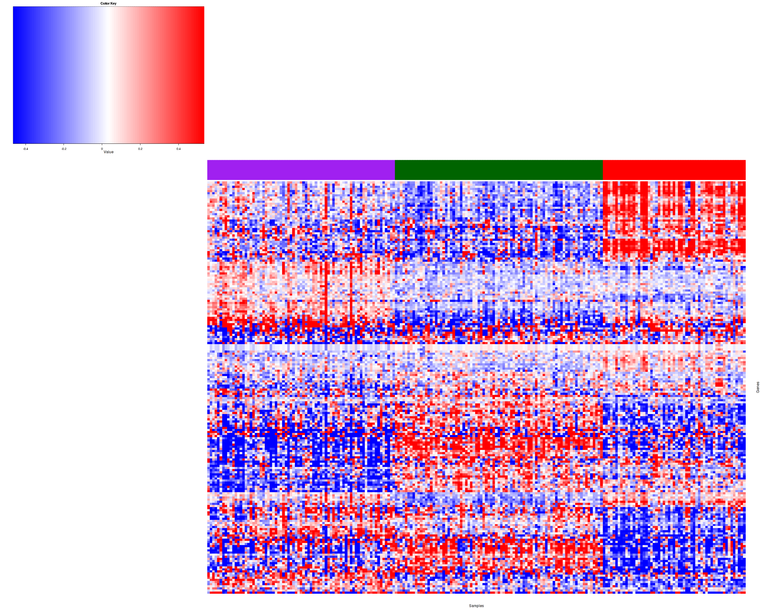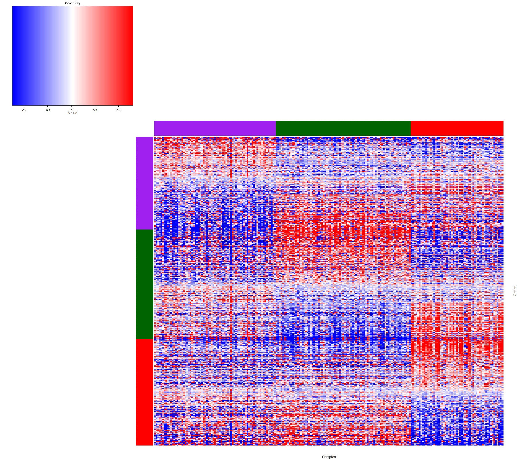 Figure 1. Get High-res Image Samples were separated into 3 clusters. Shown are 215 samples and 441 marker proteins. The color bar of the row indicates the marker proteins for the corresponding cluster.