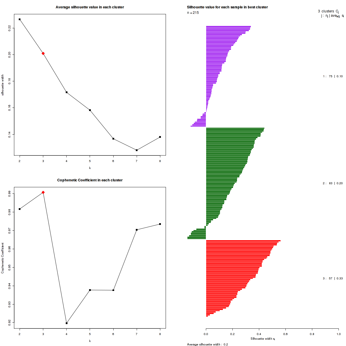 Figure 3. Get High-res Image The silhouette width was calculated for each sample and each value of k. The left upper panel shows the average silhouette width across all samples for each tested k (left upper panel). The left lower panel shows the Cophenetic Correlation Coefficients for each tested k. The right panel shows assignments of clusters to samples and the silhouette width of each sample for the most robust clustering.