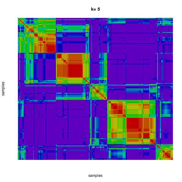 Figure 4. Get High-res Image The consensus matrix after clustering shows 5 clusters with limited overlap between clusters.