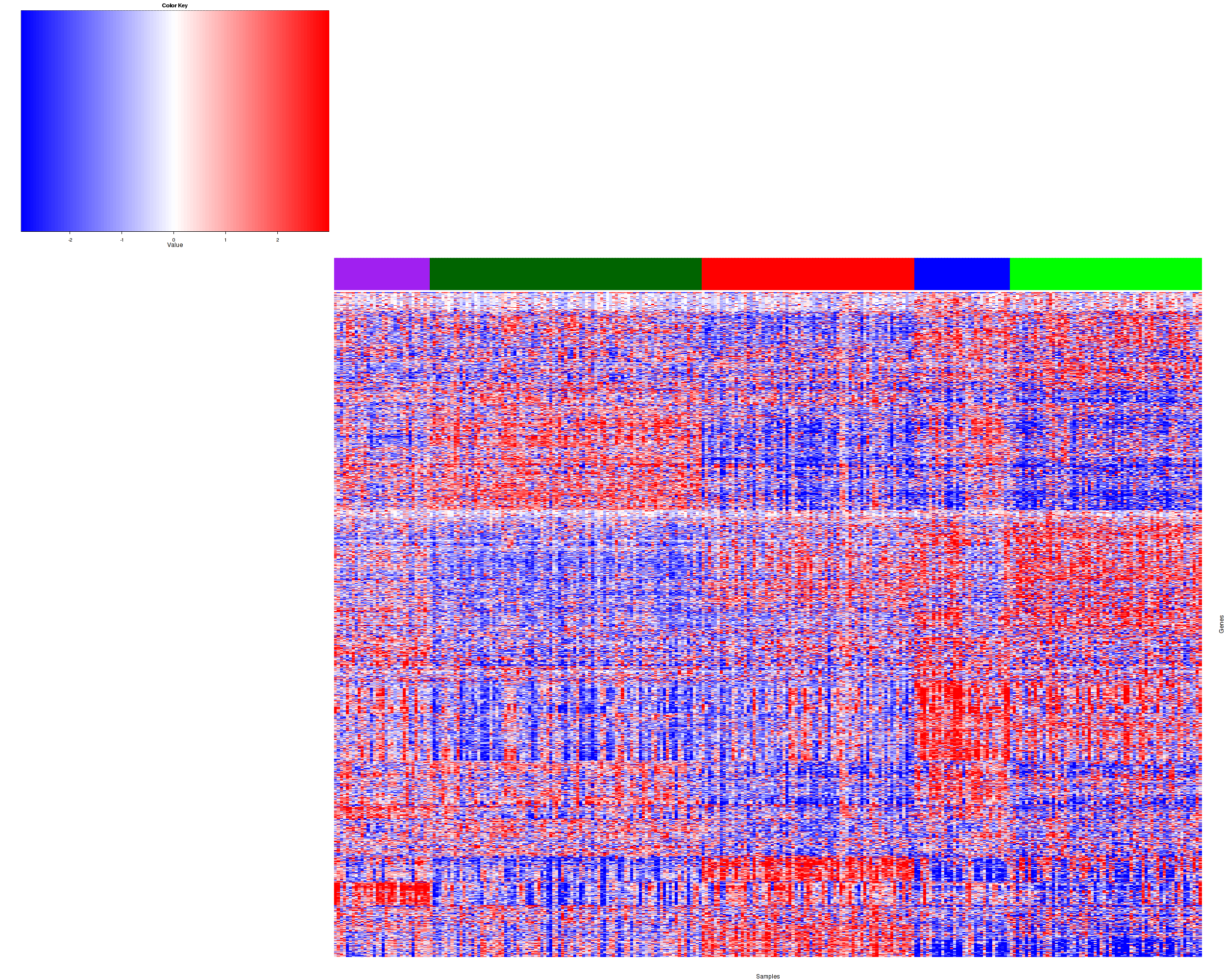 Figure 1. Get High-res Image Samples were separated into 5 clusters. Shown are 290 samples and 1500 marker genes. The color bar of the row indicates the marker genes for the corresponding cluster.