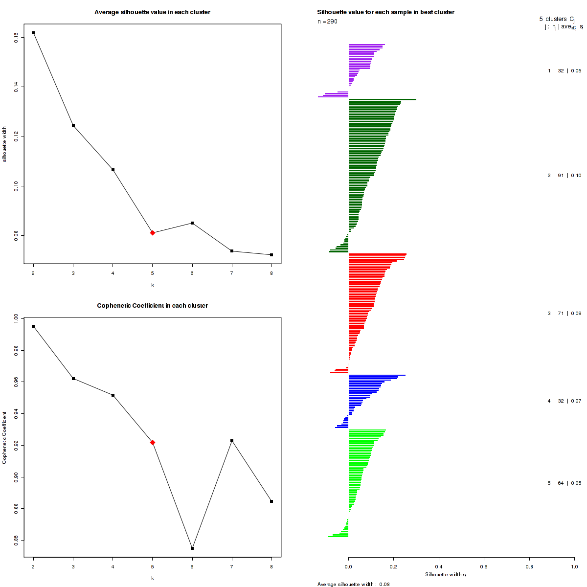 The most robust consensus NMF clustering of 290 samples using the 1500 most variable genes was identified for k = 5 clusters. We computed the clustering for k = 2 to k = 10 and uused the cophenetic correlation coefficient and the average silhouette width calculation to determine the robust clusters.