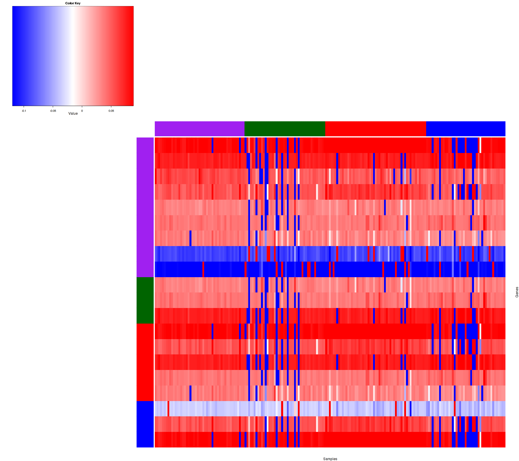 Figure 1. Get High-res Image Samples were separated into 4 clusters. Shown are 191 samples and 20 marker focal events. The color bar of the row indicates the marker focal events for the corresponding cluster.