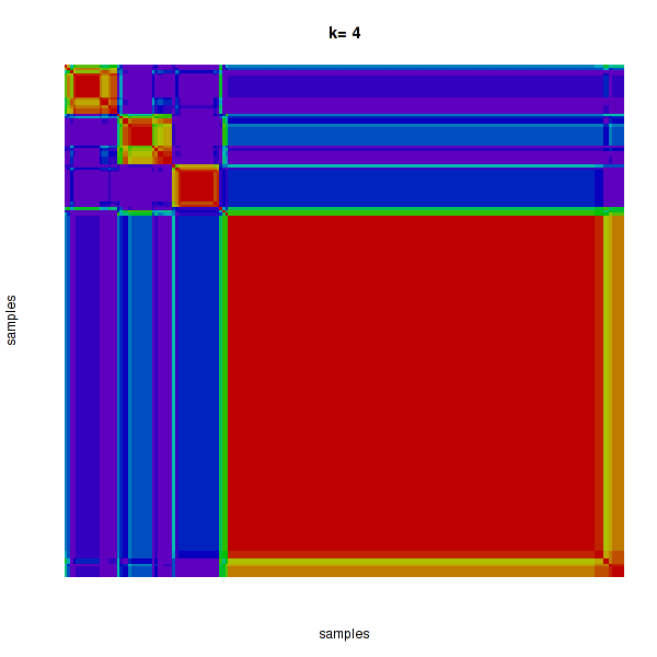Figure 4.  Get High-res Image The consensus matrix after clustering shows 4 clusters with limited overlap between clusters.
