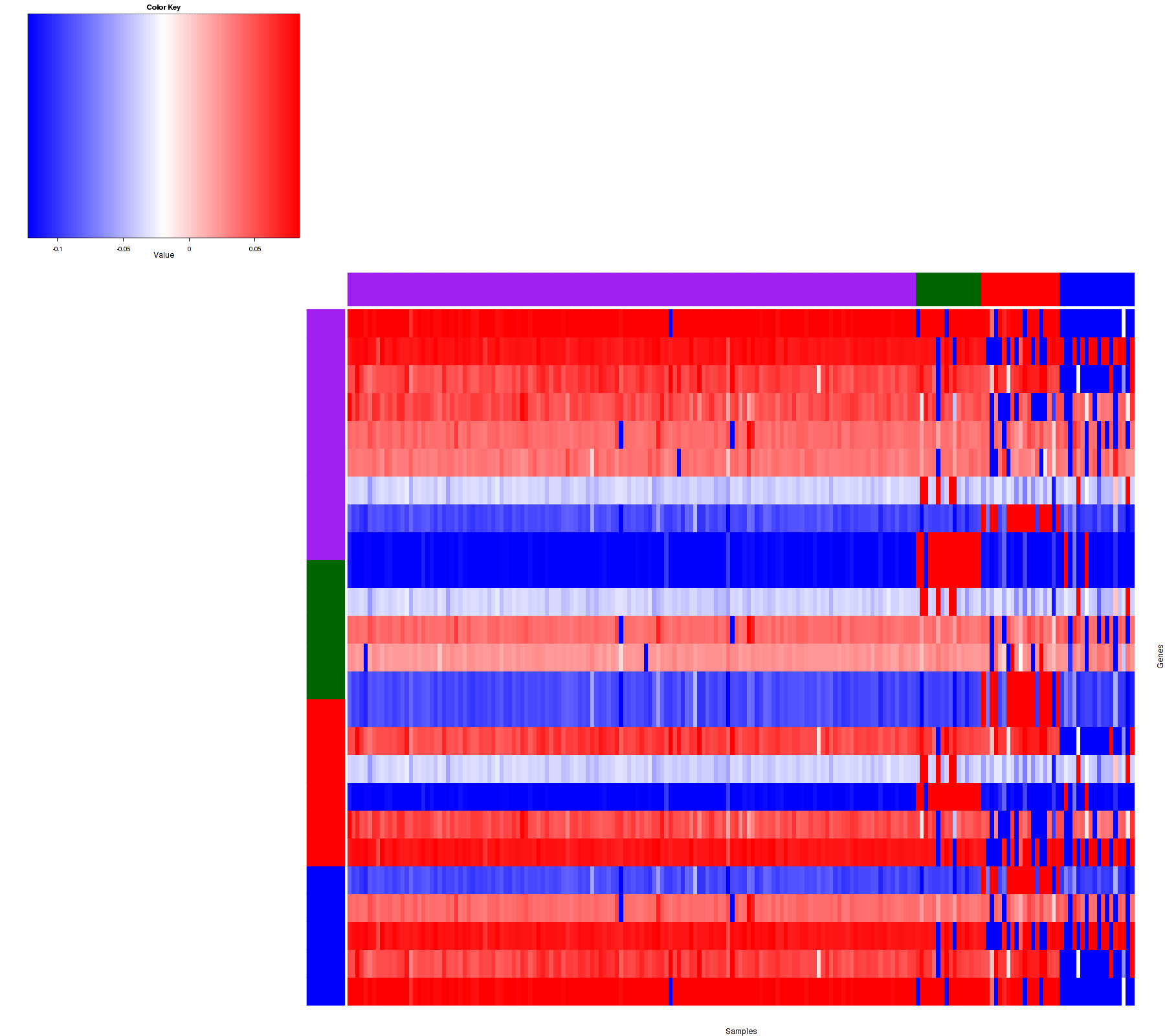 Figure 1.  Get High-res Image Samples were separated into 4 clusters. Shown are 191 samples and 25 marker focal events. The color bar of the row indicates the marker focal events for the corresponding cluster.