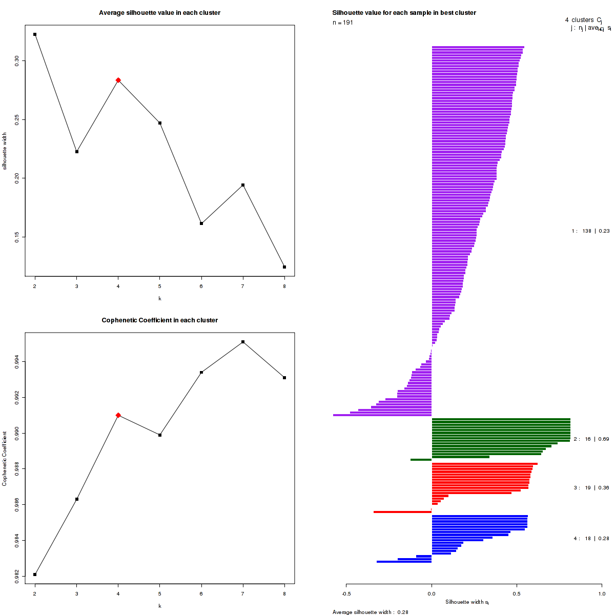 Silhouette widths, Cophenetic Correlation Coefficients and Consensus matrix