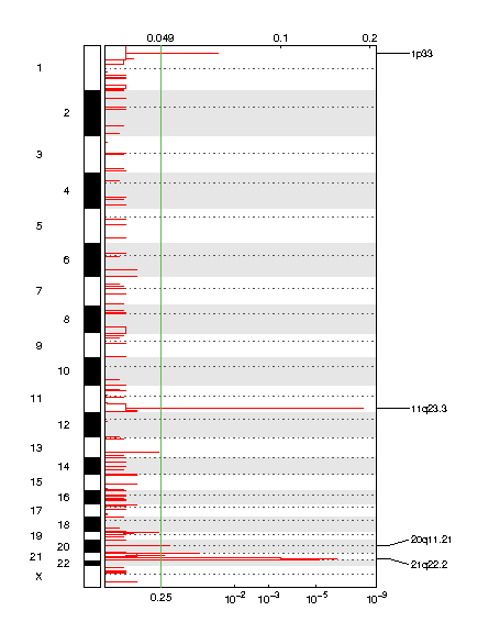 | 21q22.2 | 7.0827e-07 | 7.0827e-07 | chr21:39509205-42282190 | 22 |