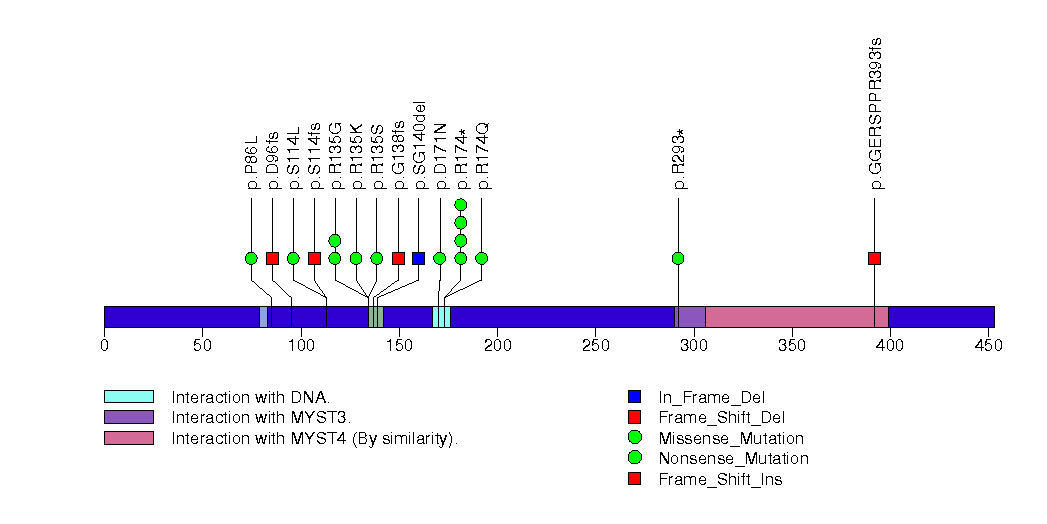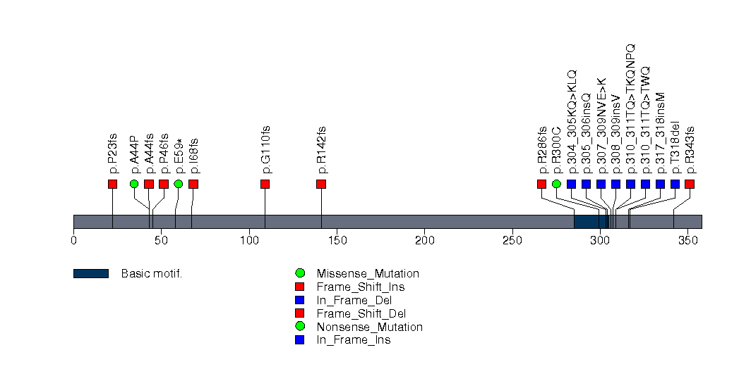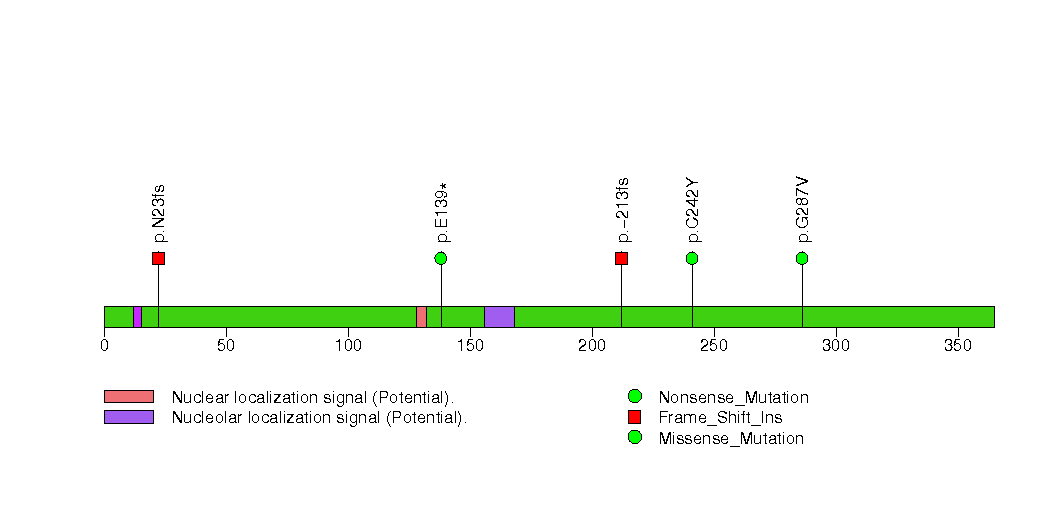 Figure S12. This figure depicts the distribution of mutations and mutation types across the TP53 significant gene.