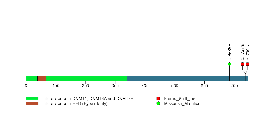 Figure S2. This figure depicts the distribution of mutations and mutation types across the DNMT3A significant gene.