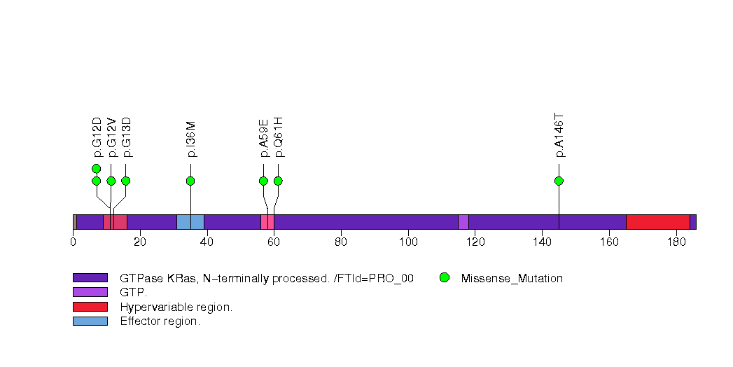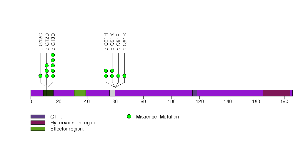 Figure S13. This figure depicts the distribution of mutations and mutation types across the KRAS significant gene.